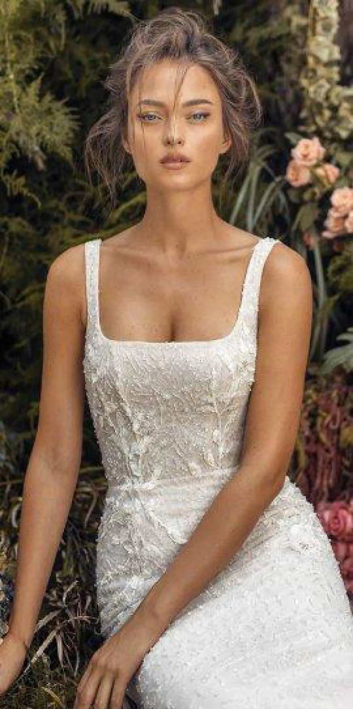 للعروس التي تملك قواماً ممشوقاً، يمكن أن تختار فستان ضيق بقبّة مربعة مثل فستان زفاف Lihi Hod المزين بتطريزات الورود البارزة باللون الأبيض.