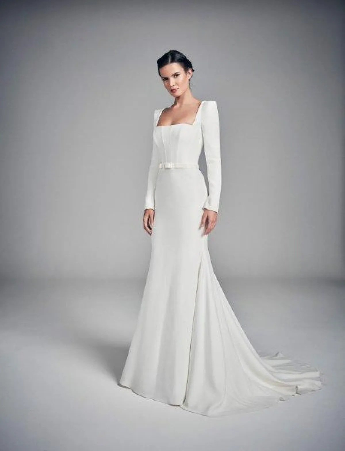 قدمت ماركة Alexandra Grecco فستان زفاف بقبّة مربعة وبأكمام طويلة مع تنورة ضيقة من أعلى وتتسع من أسفل.