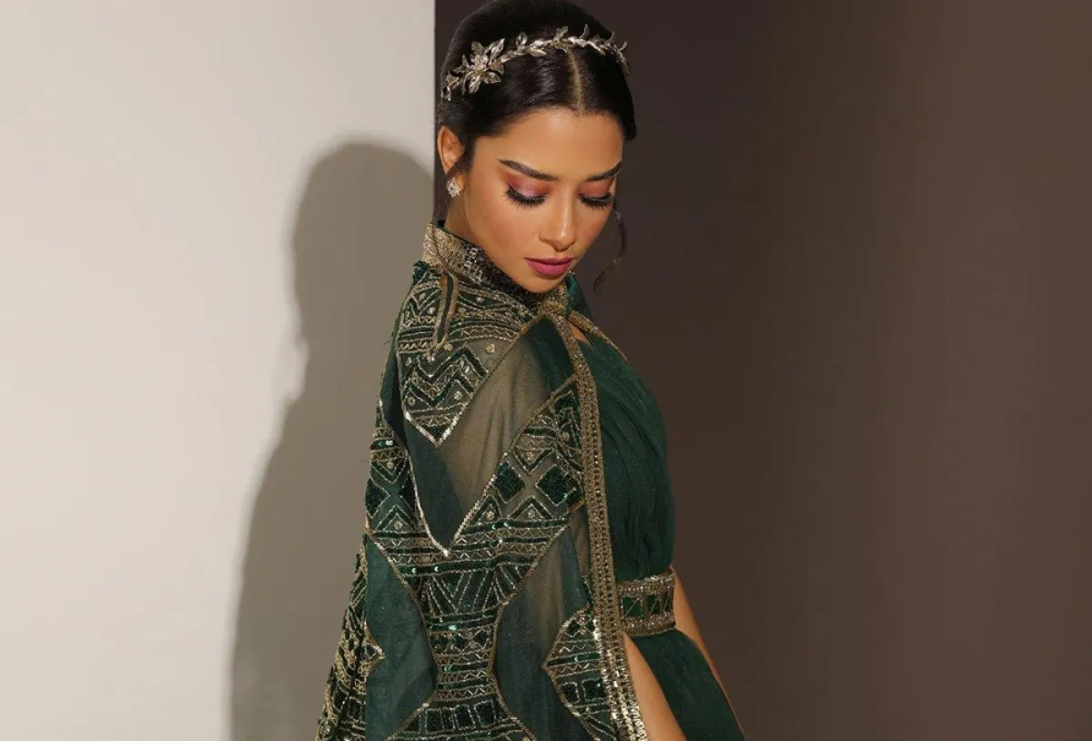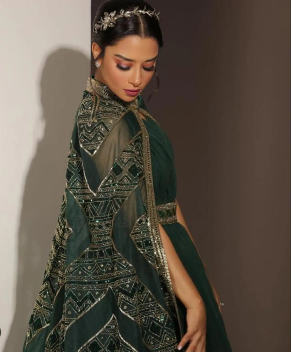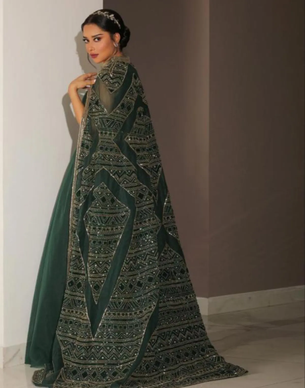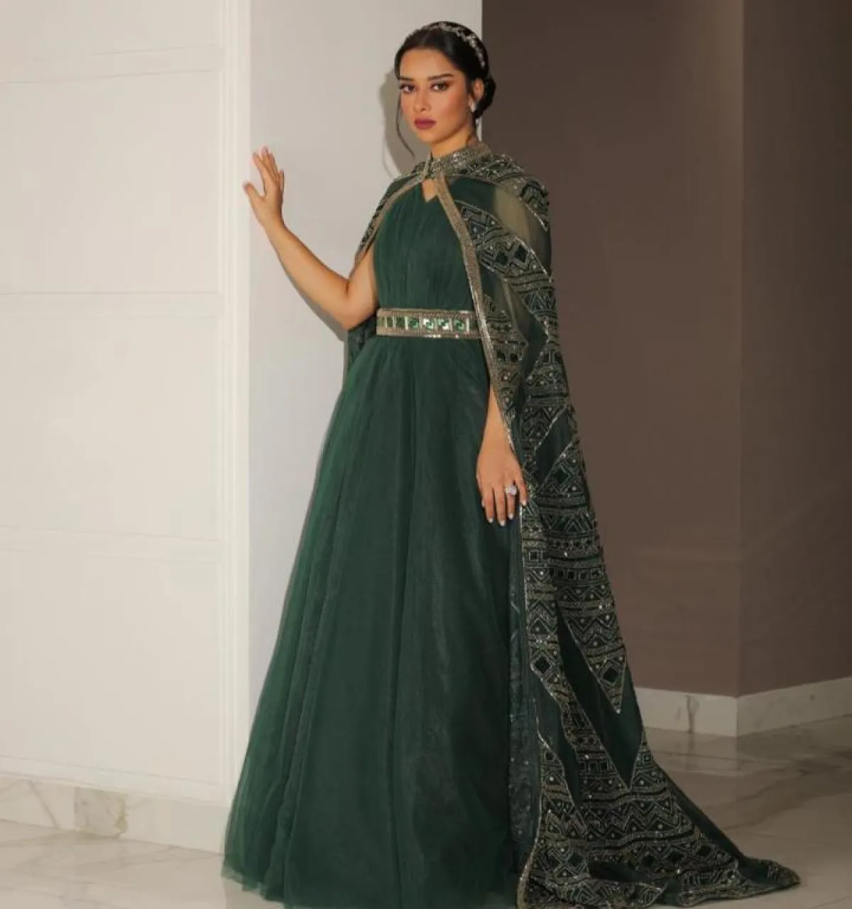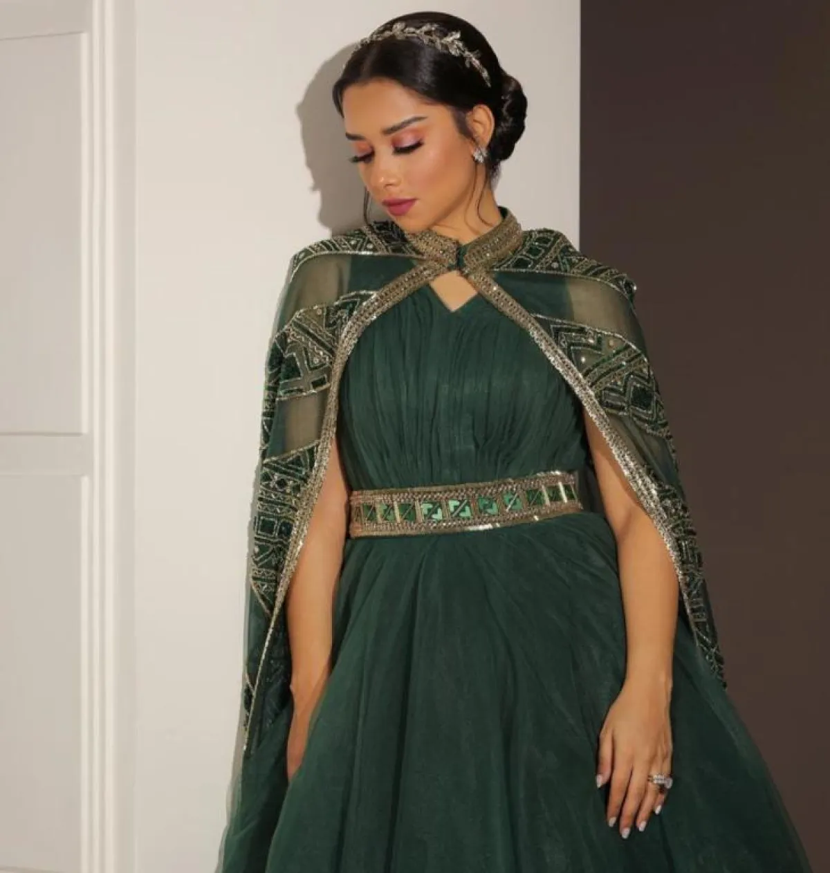 لتفاصيل إطلالتها تالقت بلقيس بفستان من تصميم دار لابورجوازي والذي جاء بتصميم منفوش باللون الأخضر ومزين بحزام ذهبي في المنتصف مصمم بكرستالات خضراء وأكملته بوشاح شفاف اخضر مزين بنقوش لامعة ونسقت إطلالتها بإكسسوار ذهبي للشعر وجملت اللوك بأقراط فضية دائرية وخواتم فضية بفصوص لامعة وسرحت شعرها المصففة منيرة التونسية بتسريحة مرفوعة جملت مظهرها ووضعت بلقيس مكياجها بنفسها وكان مكون من طلاء الشفتين الفوشي وبلاشر زهري بدرجة فاتحة واستخدمت في تجميل عينيها ظلال الأعين بدرجة لامعة ووضعته بطريقة مسحوبة.