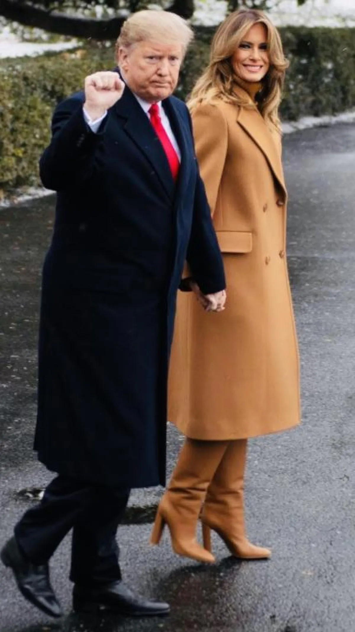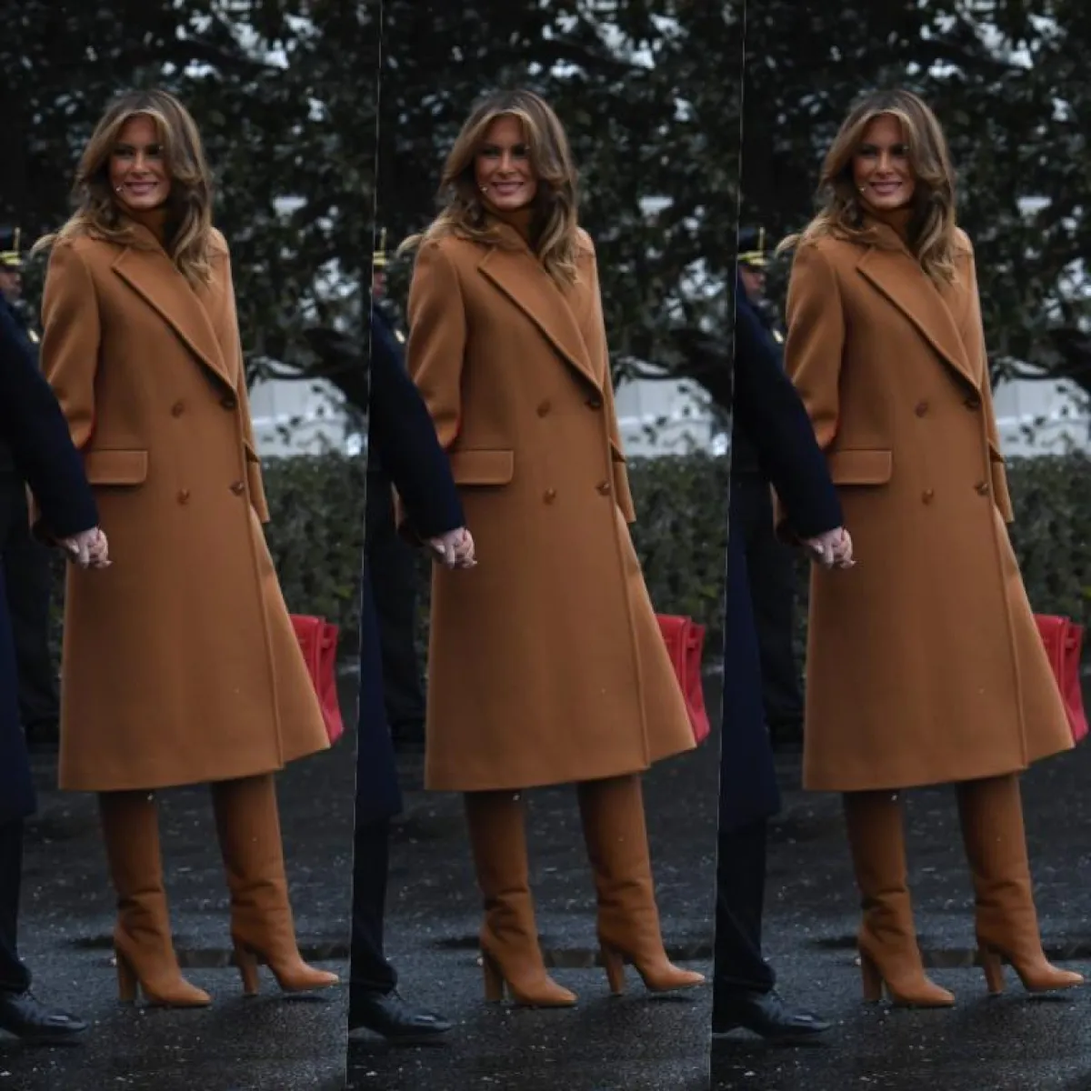 نسقت ميلانيا ترامب معطف ميدي بتوقيع دار بربري مع حذاء البوت المزود برقبة وصلت إلى الركبة، وتميز التصميم بصيحة الـ slouchy المهدلة على الساق وخاصة من الكاحل، اختارت ميلانيا ترامب لون وخامة البوت بنفس تفاصيل المعطف لتظهر باللون البني المتوسط من الرأس وحتى أخمص القدمين.
