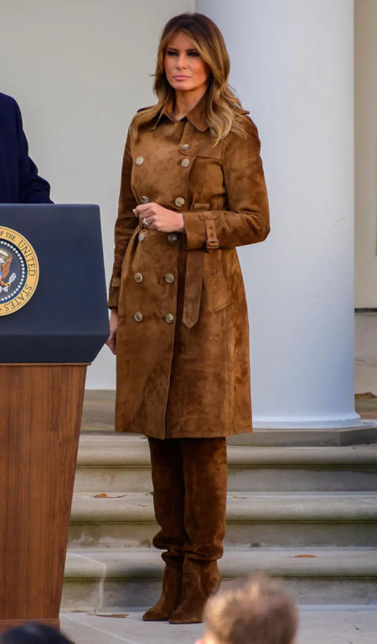 اعتمدت ميلانيا ترامب إطلالة كاملة باللون البني المتوسط، الذي يعد أحد الألوان البارزة في الخريف و الشتاء، وما عزز جمال اللون، اختيار خامة الشمواه، أو كما تُعرف بالجلد السويدي، وهو أيضاً خياراً مترفاً من موضة هذا العام.