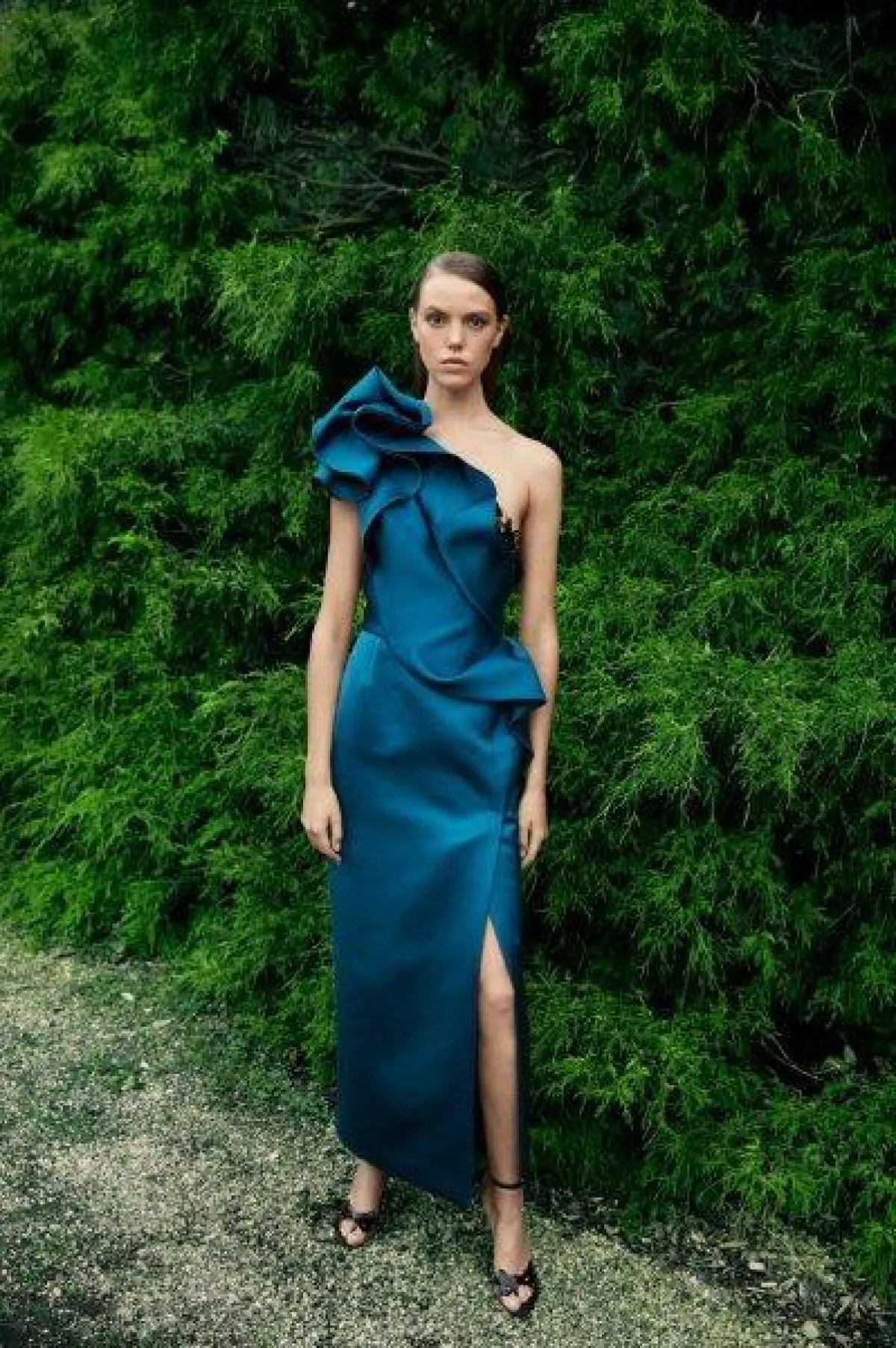 كما قدمت ماركة ماركيزا Marchesa فستان أزرق ستان بكتف واحد وبكشاكش زادت من جاذبيته مع شق جانبي طويل.