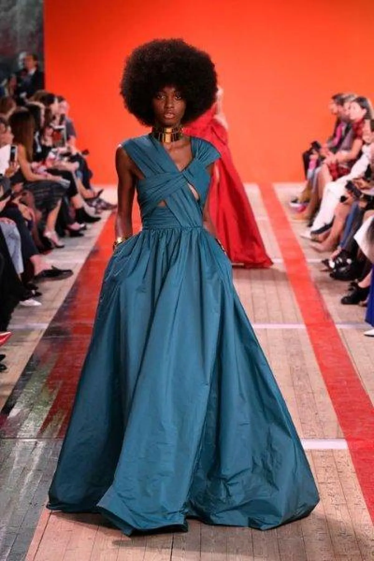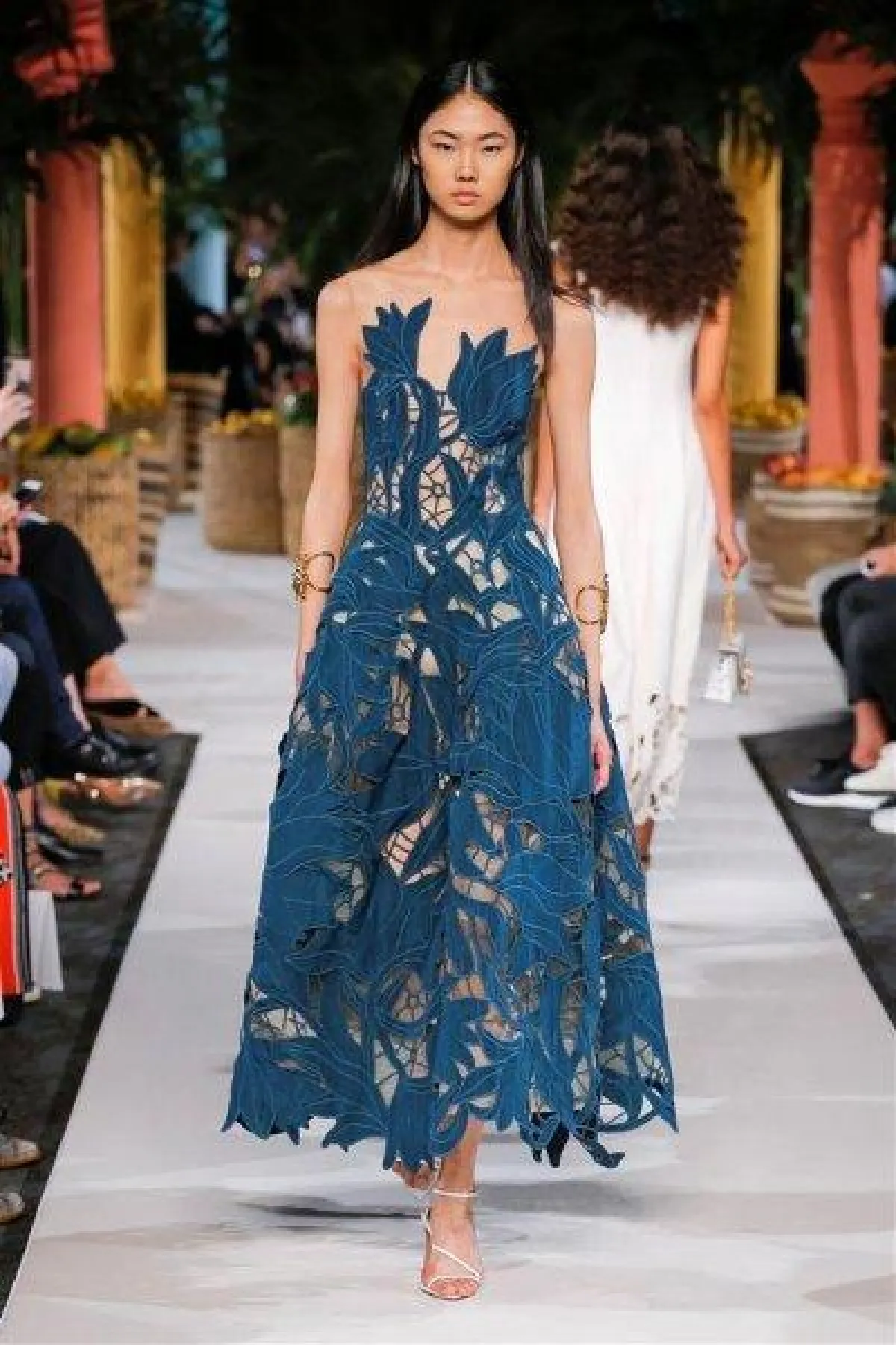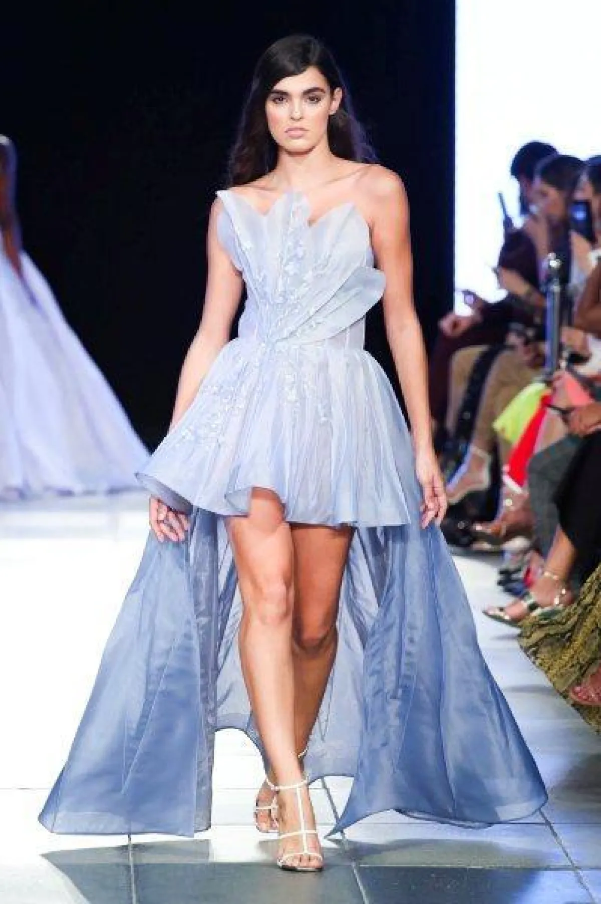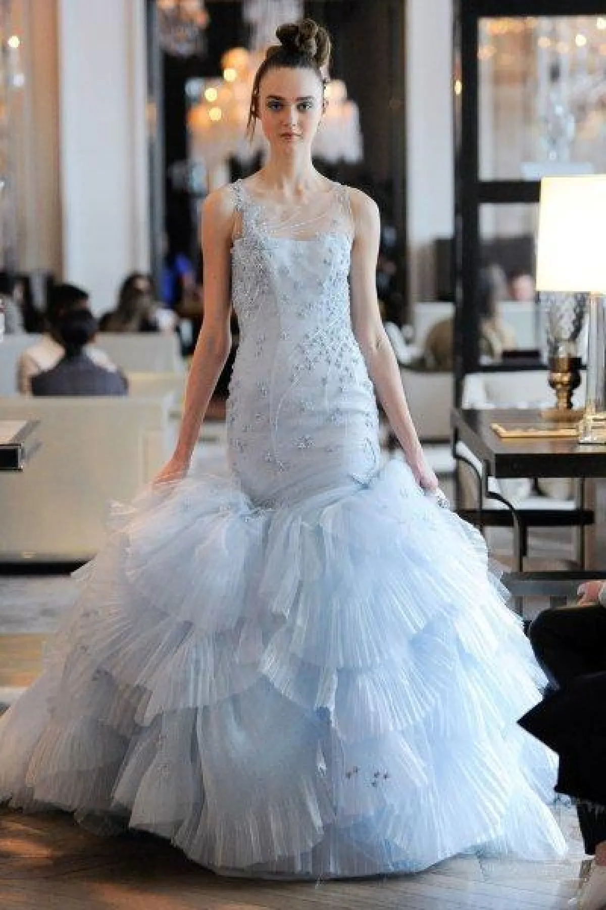 كما قدمت ماركة انيس دي سانتو Ines di Santo فستان بقصّة حورية البحر Mermaid الذي يبرز انحناءات القوام الممشوق بلون أزرق فاتح وبتنورة طبقات منفوشة.