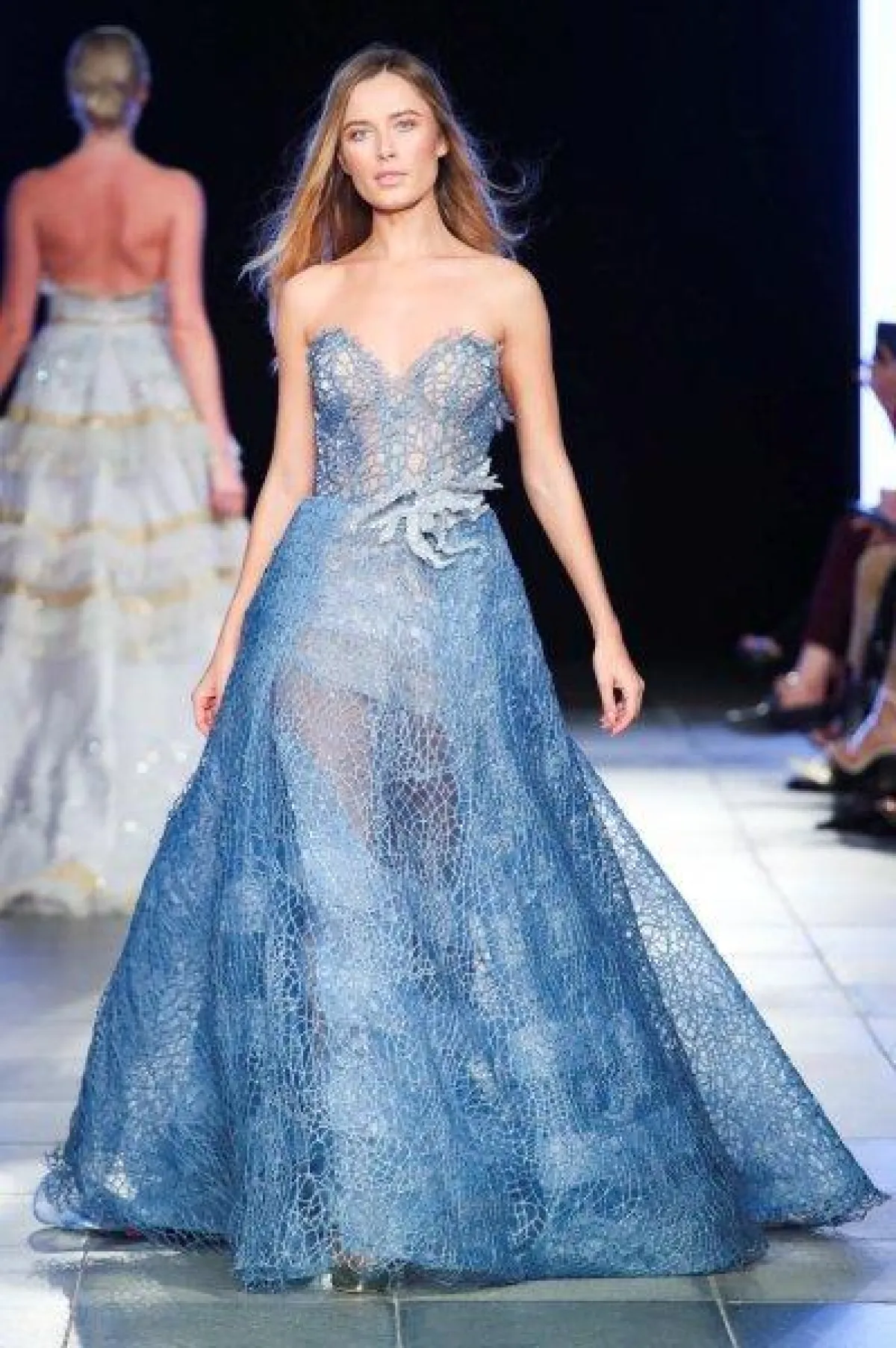 وقدم المصمم اللبناني ايلي صعب فستان أزرق منفوش بتصميم ناعم يخلو من التطريزات لإطلالة تجمع بين الرقي والعصرية.