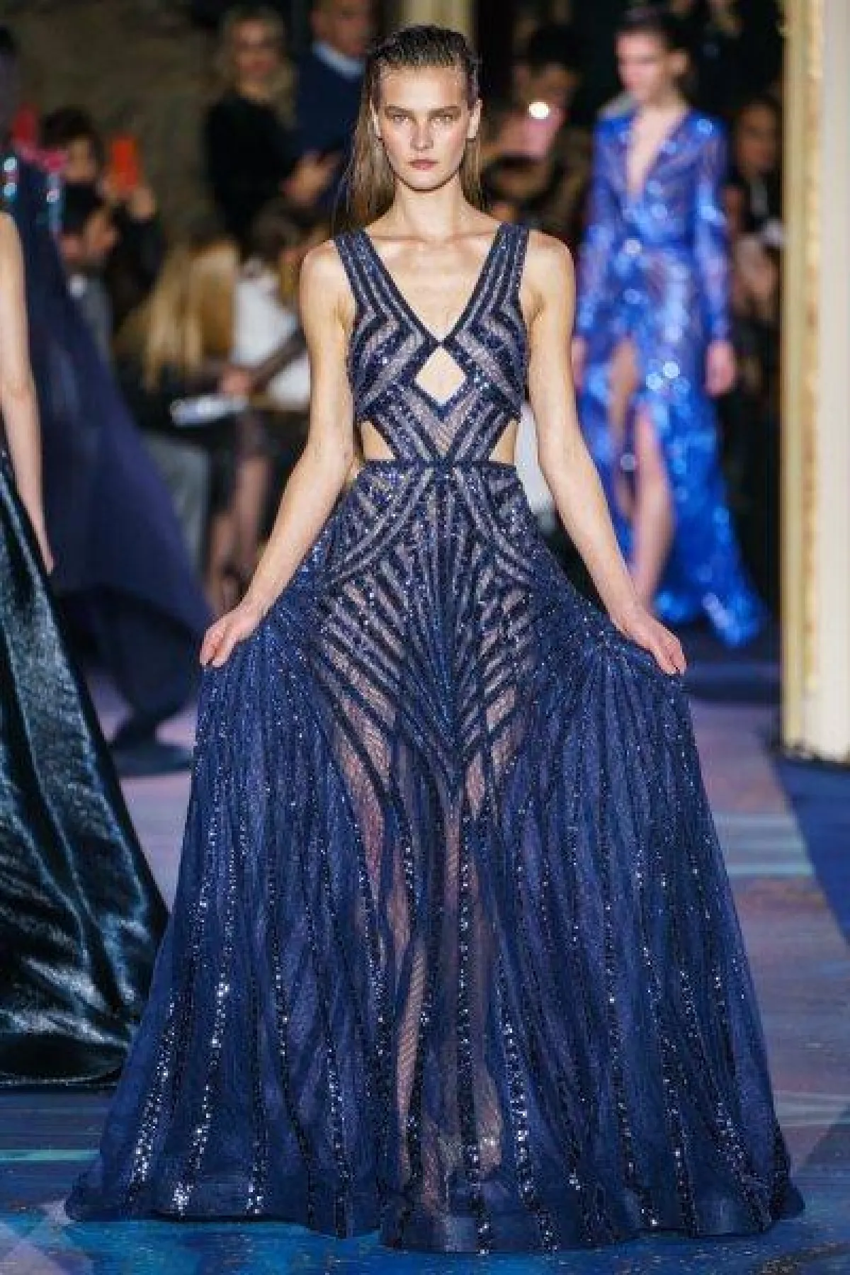 وأحببنا فستان زهير مراد الأزرق والمرصع بتطريزات برّاقة تزيد من سحره، وهو بقماش شفاف وبحمّالات عريضة مع قبّة V.