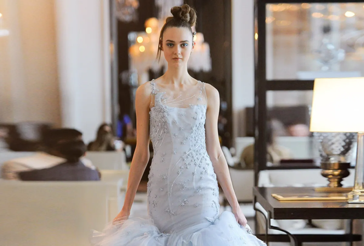 قدمت ماركة كريستيان سيريانو Christian Siriano فستان خطوبة منفوش باللون الأزرق وبتنورة طبقات مع صيحة تحاكي الجاكيت من أعلى وحزام يحدد الخصر، ليجمع بين الفخامة والرقي.