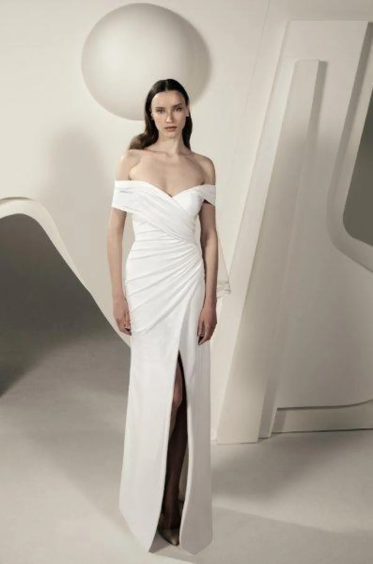 قدمت ماركة Alon Livné فستان زفاف عمودي بقصّة ملتفة وأكمام أوف شولدر وشق أمامي طويل، يكسب العروس طولاً ونحافة.