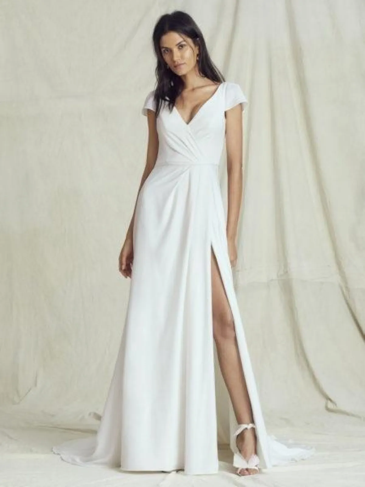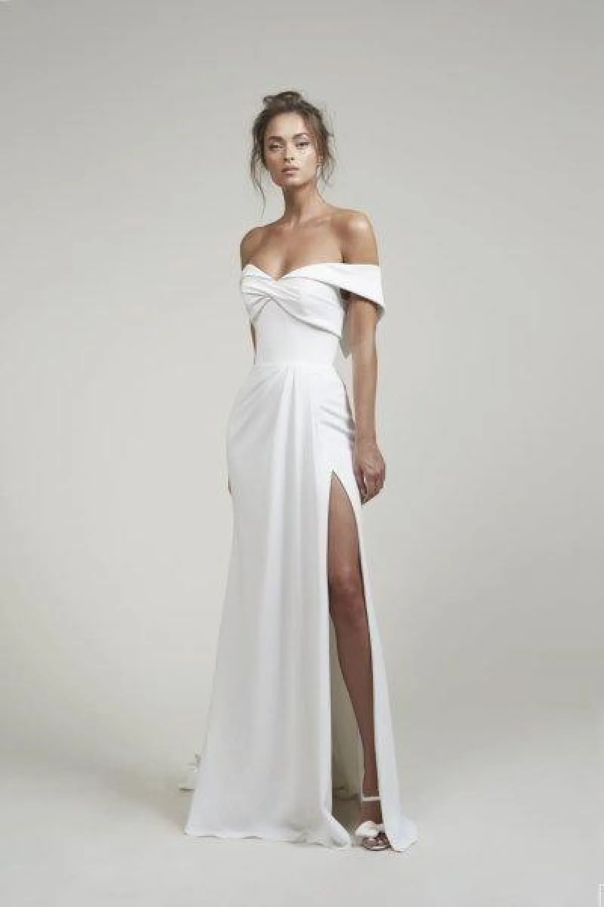 كما قدمت ماركة Lihi Hod فستان زفاف ناعم بقصّة Wrap وبأكتاف منسدلة مع شق أمام طويلة.