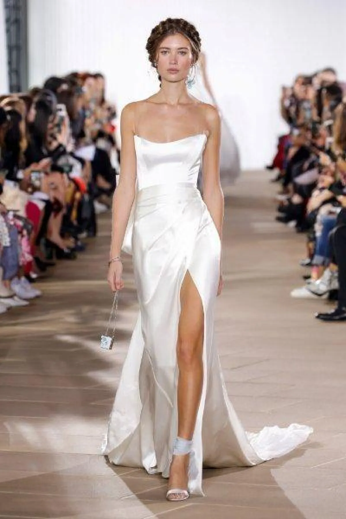 بقماش الستان الراقي، قدمت ماركة انيس دي سانتو فستان ناعم بالقصّة الملتفة من الأمام مع شق أمامي طويل.