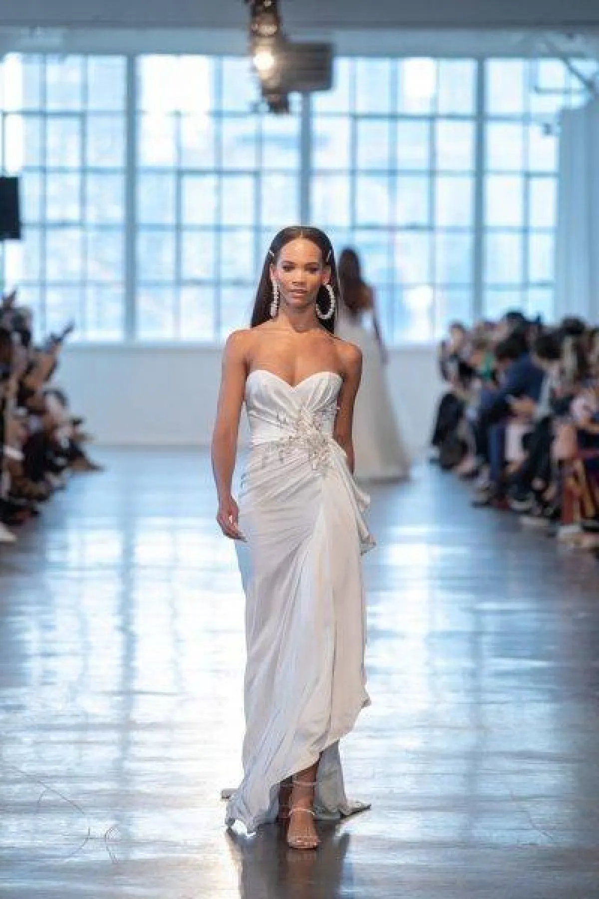 أيضاً قدمت ماركة Berta فستان زفاف بقصّة Wrap ومزين باكسسوار برّاقة على البطن مع قصّة بسيطة وعصرية.