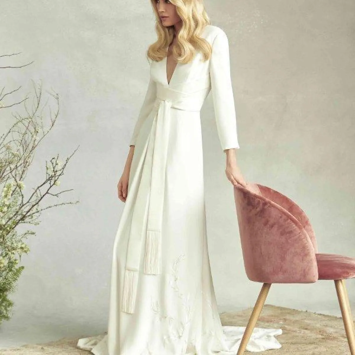تميز فستان Savannah Miller بالبساطة والرقي، وهو بقبّة V وأكمام طويلة مع قصّة ملتفة وحزام طويل مزين بالشراشيب.