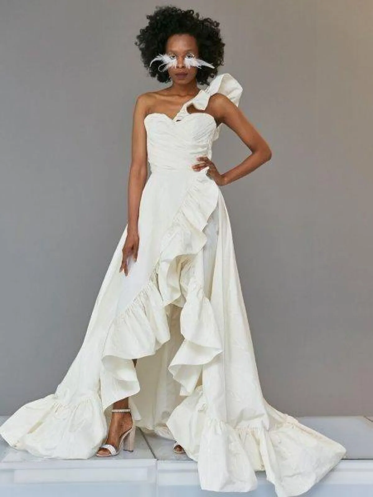 تصميم عصري ولافت للأنظار من Francesca Miranda، وهو فستان بتموجات ناعمة من الأمام مع قصّة ملتفة وتنورة High Low.