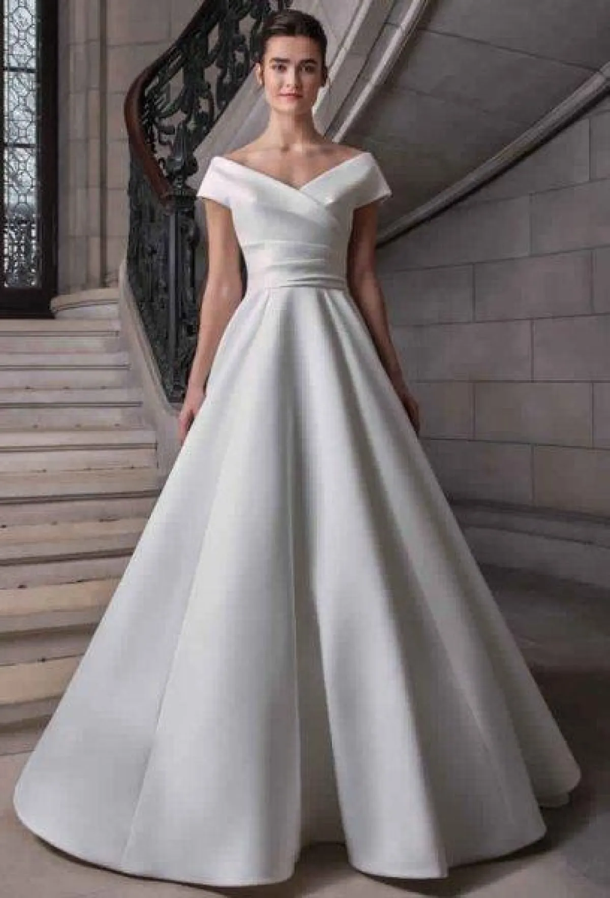 يجمع فستان زفاف Sareh Nouri بين الكلاسيكية والرقي، وهو بتنورة منفوشة وأكتاف منسدلة قليلاً وقصّة ملتفة.