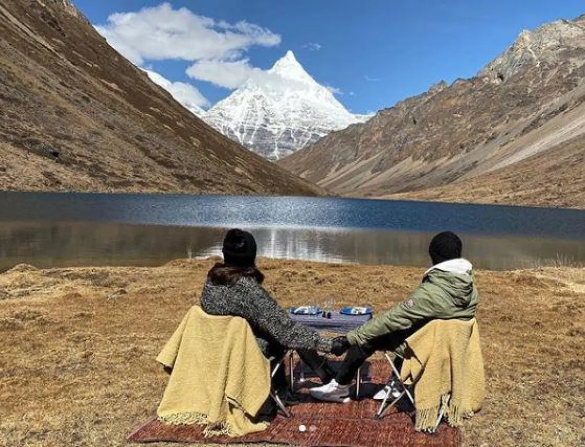 ويظهر الثنائي في إحدى الصور يجلسان معًا أمام بحيرة كبيرة، وأمامهما الجبال والقمم الجبلية، وفي صورة أخرى تظهر أنوشكا حاملةً كلبًا صغيرًا، ومن الواضح أنّ شارما وكولي قضيا أجمل الأوقات في هذه المنطقة، بعد فترة مليئة بالعمل والإرهاق.