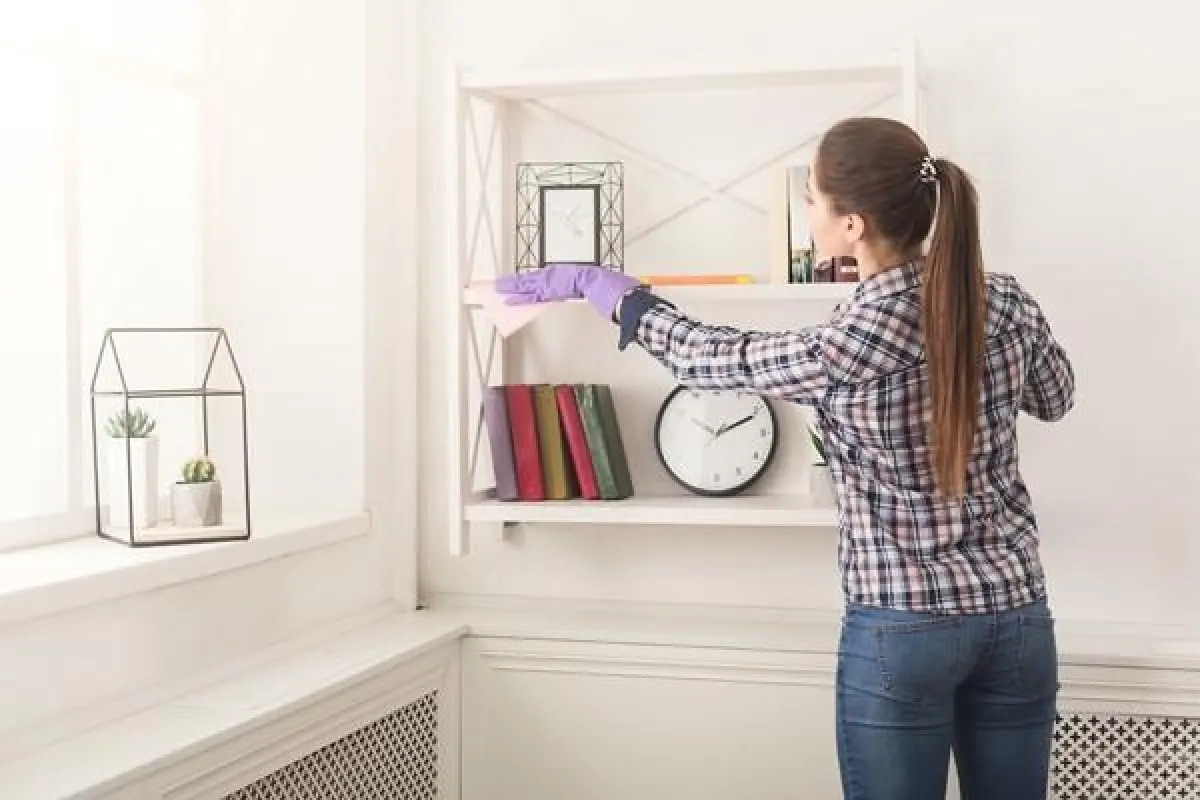 • تنظيف الأثاث المنزلي، مثل: الطاولات، والأرفف، والخزائن، والبراويز والصور المعلقة، عن طريق مسحها.
