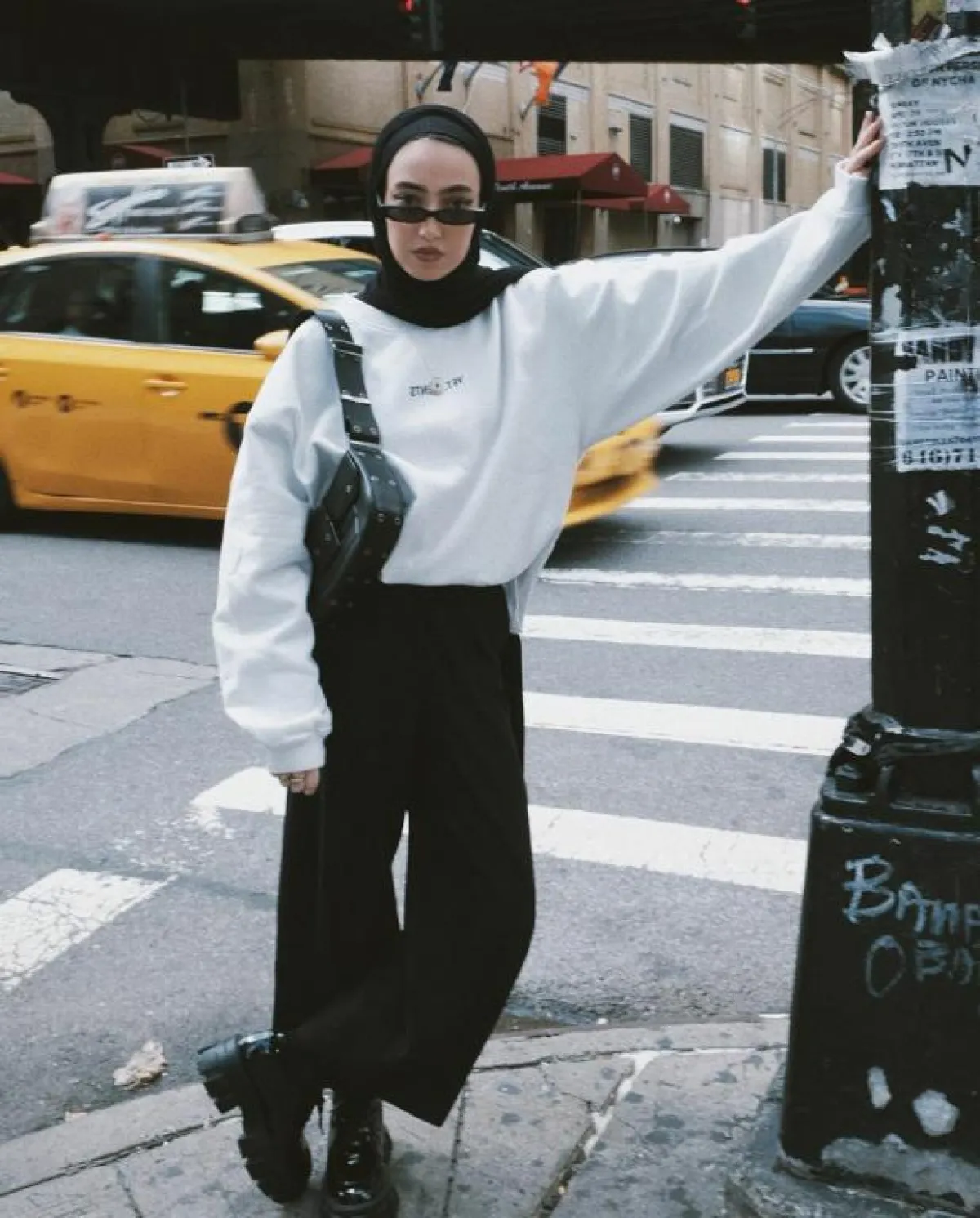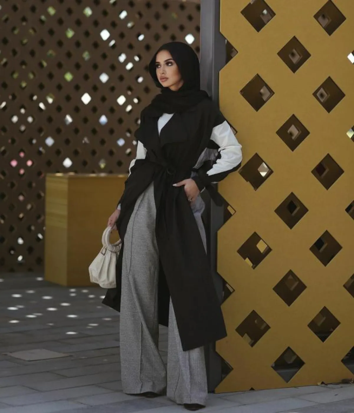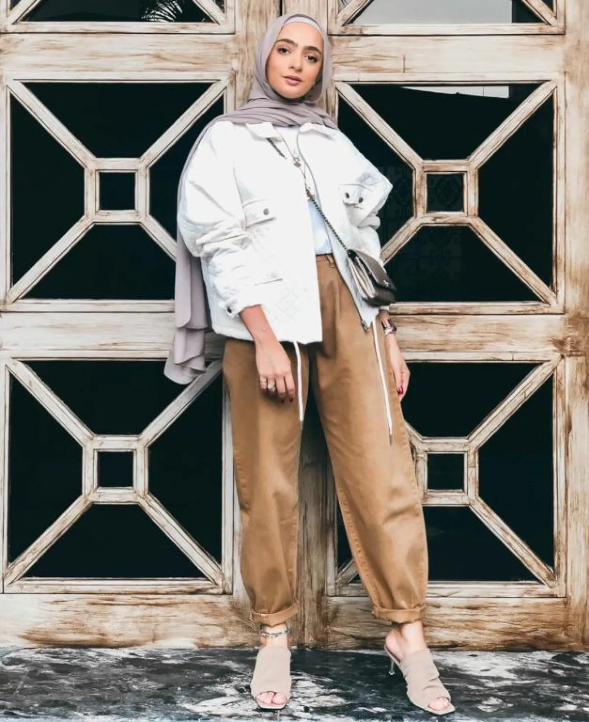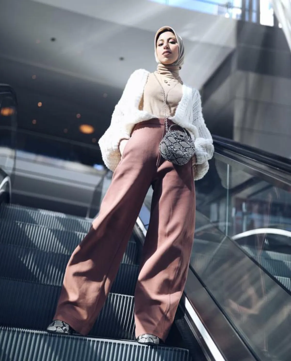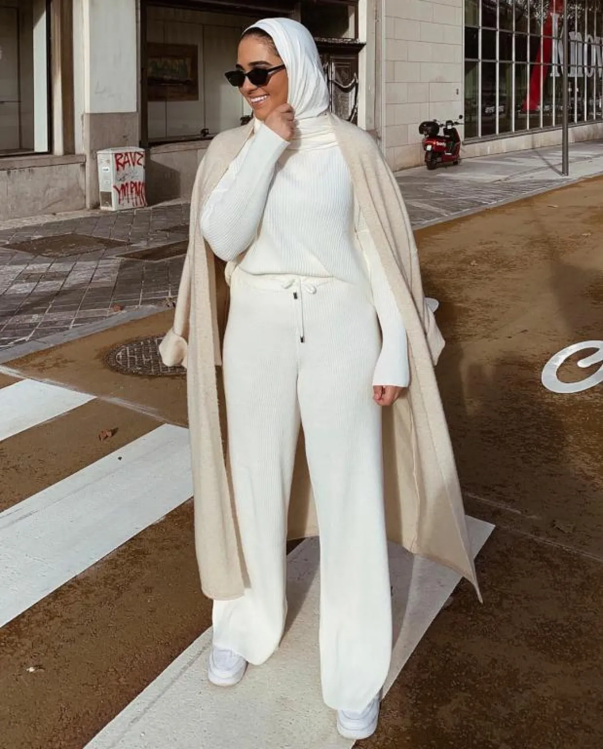لا تترددي هذا الموسم في إعتماد اللون الأبيض في كامل إطلالتك، نسقي بنطال أبيض واسع مع توب من نفس اللون شرط أن يكون برقبة عالية ليؤمن لكِ مزيد من الدفء وتممي أناقتك بكارديغان بيج طويل وأعتمري طرحة بيضاء.