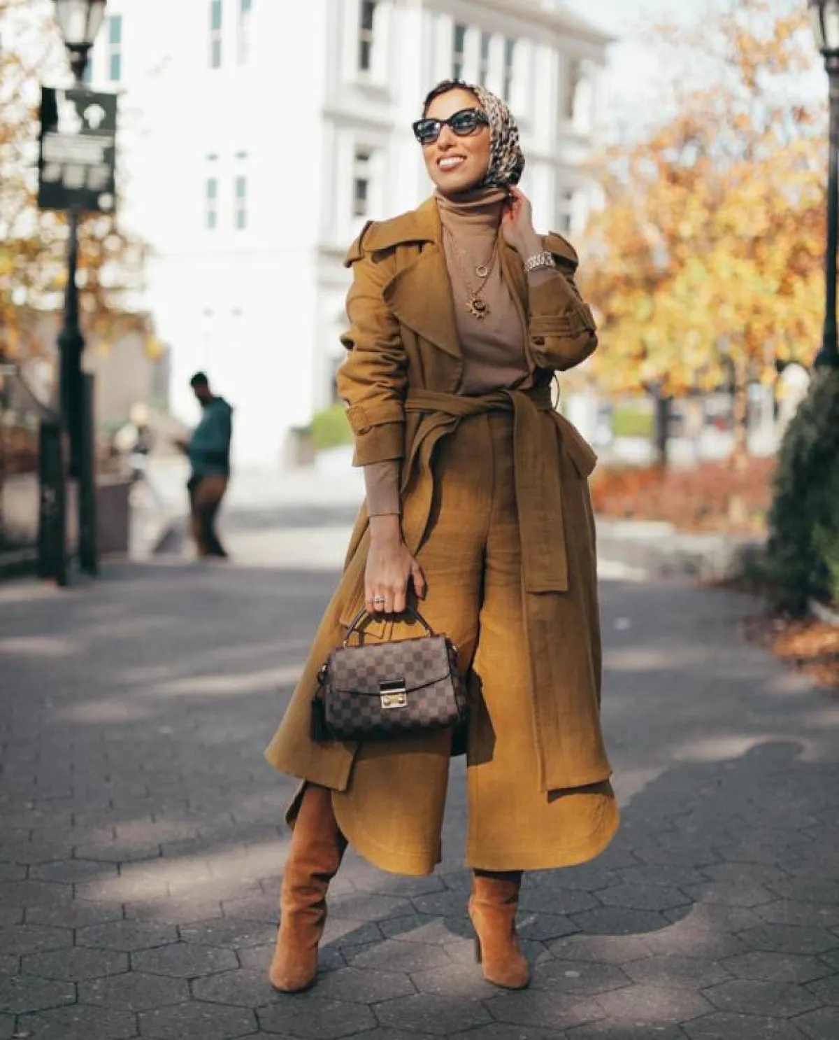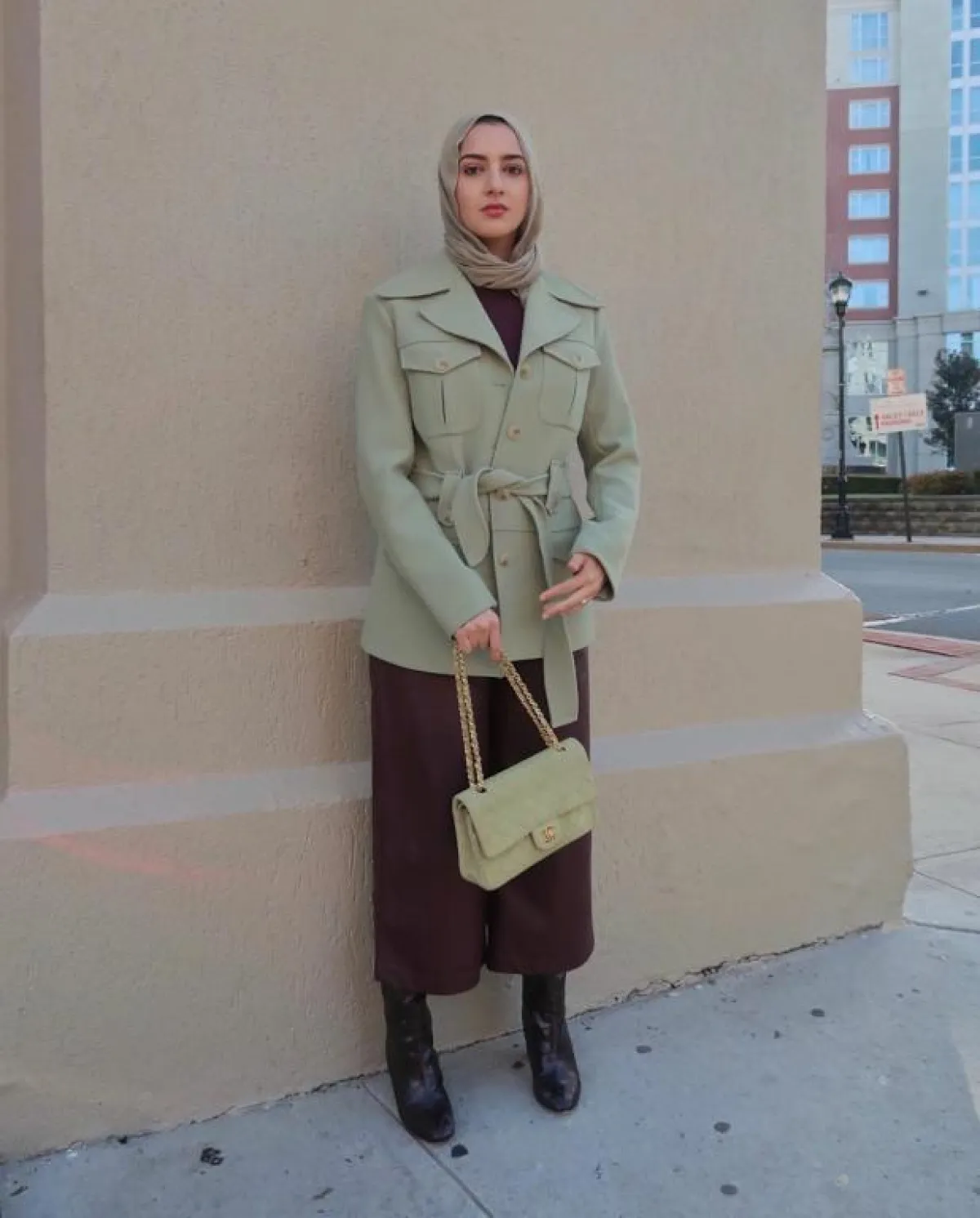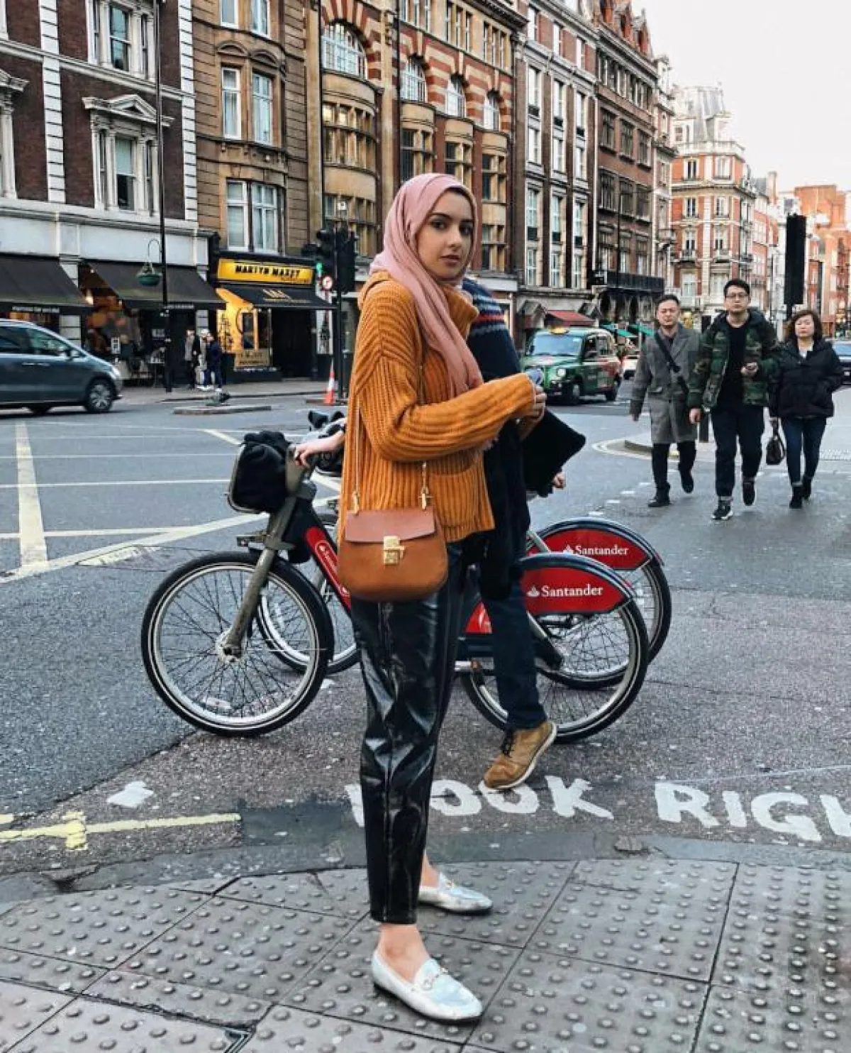 تعتبر البناطيل الجلد من أبرز إتجاهات موضة شتاء 2020، ننصحك بإختيار موديل واسع الأرجل غير ملاصق للجسم حتى يتناسب مع ستايل الحجاب المحتشم ونسقيه على غرار الفاشينيستا سمر البرشا مع كنزة صوف باللون الجملي على أن تكون الحقيبة من نفس لون التوب.