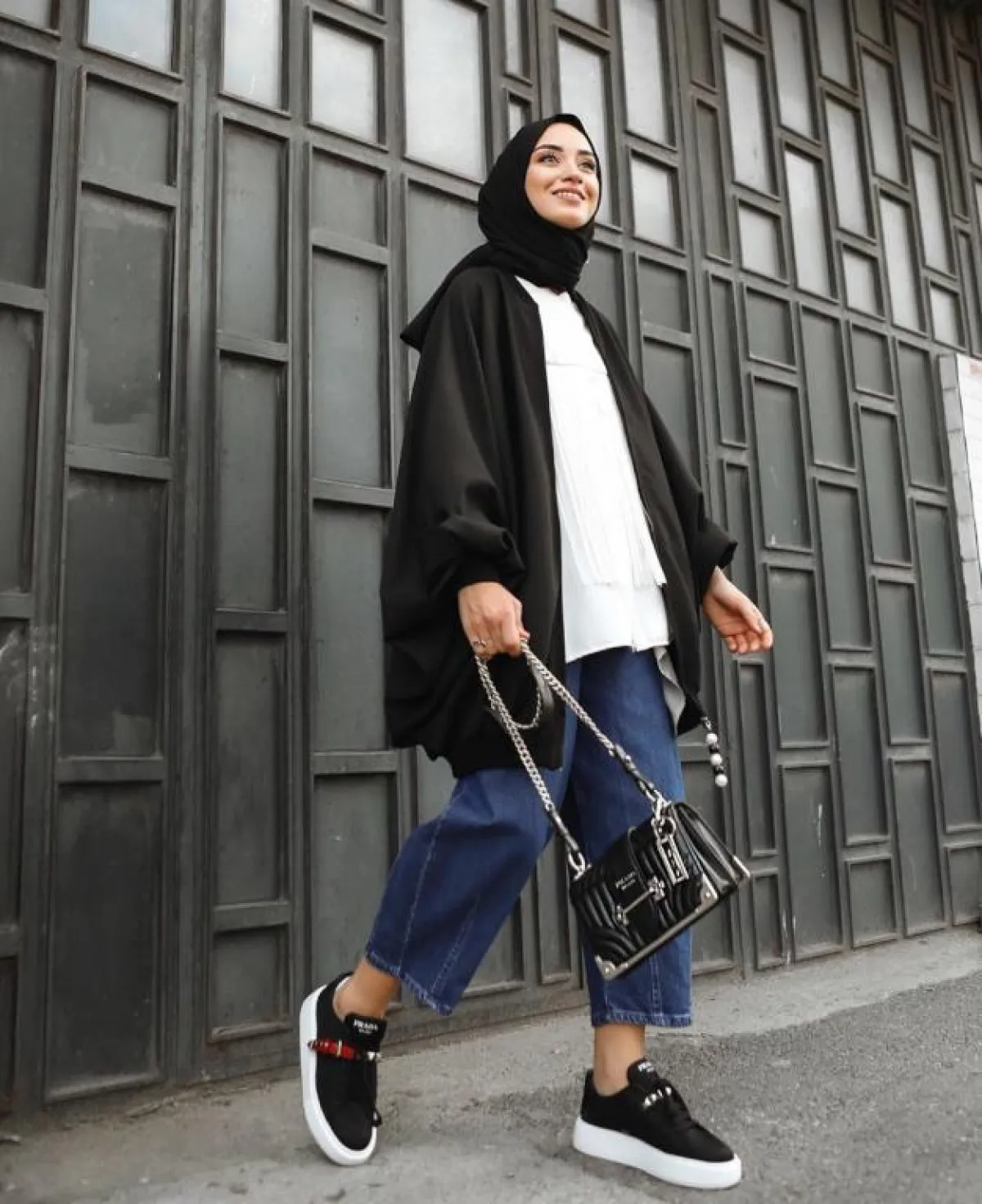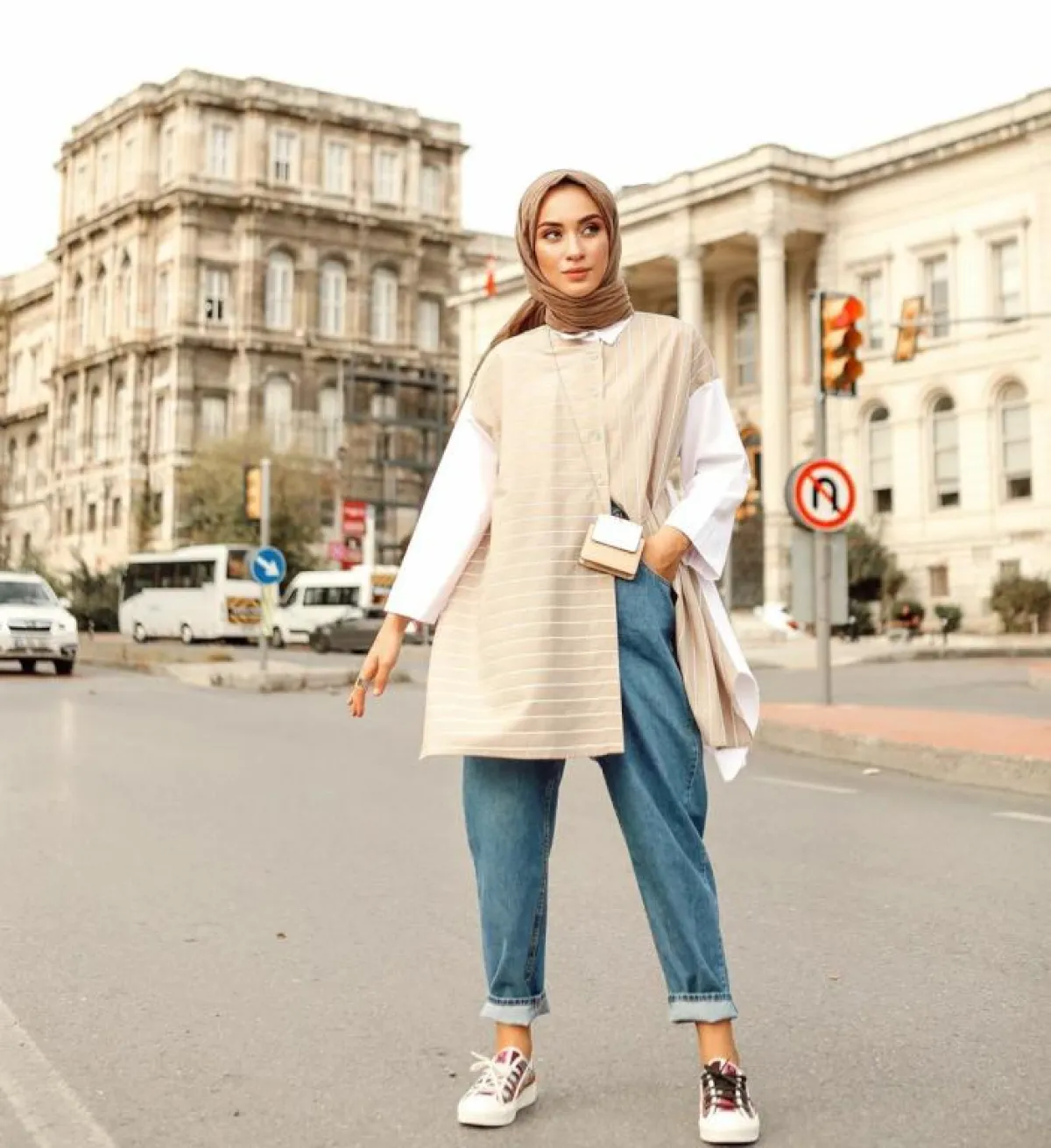 برزت هذا الموسم صيحة البناطيل الجينز واسعة الأرجل القصيرة التي تعلو الكاحل، نسقيها مع توب أبيض واسع وسترة خفيفة سوداء Oversized تخفي بروز البطن وأكملي أناقتك بحقيبة كتف سوداء مزودة بسلسال معدني وأنتعلي سنيكرز مونوكروم، أو اعتمدي بنطال جينز طويل عالي الخصر اطوي أطرافه ولائميه مع قميص مخطط واسع.