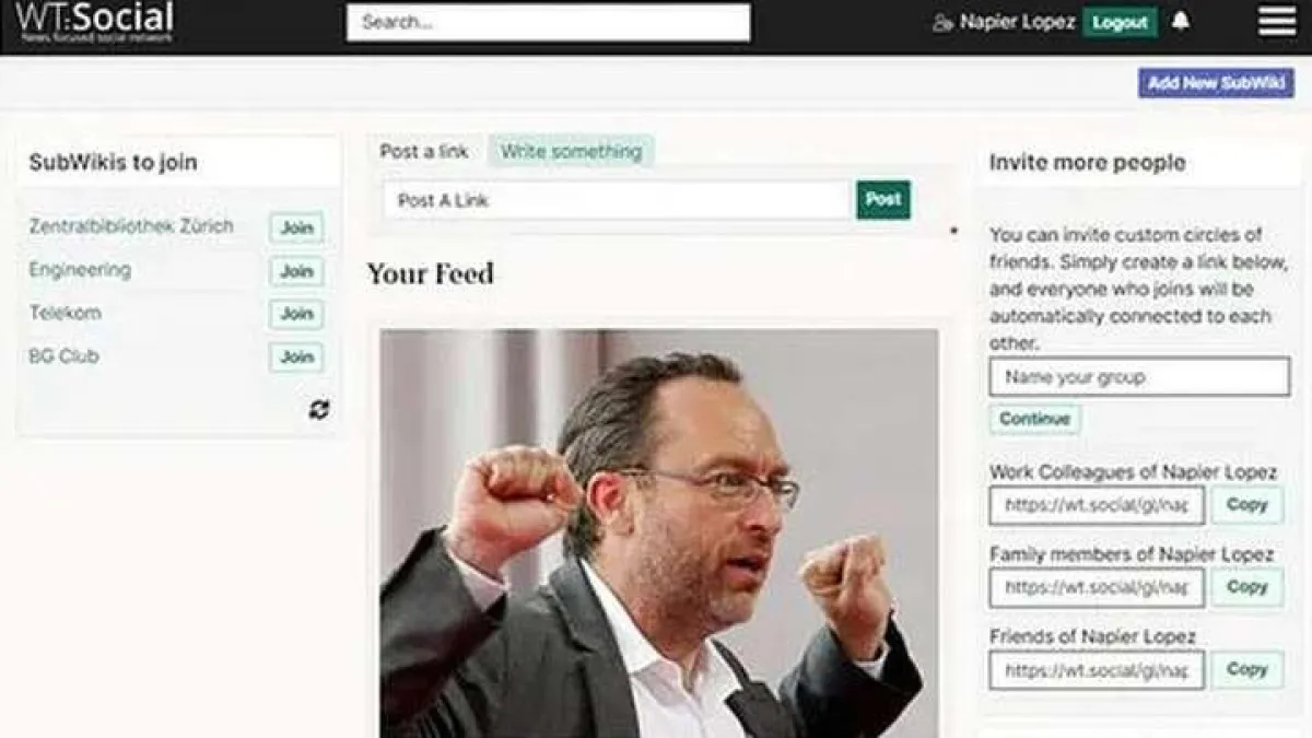 أطلق مؤسس «ويكيبيديا» «جيمي ويلز»، موقعاً منافساً لـ«فيسبوك» تحت اسم «دبليو تي دوت سوشيال»، مؤكداً أن عدد المشتركين فيه تجاوز 160 ألف مستخدم، وقال إن المنصة الجديدة لن تبيع المعلومات المتعلقة بالمستخدمين، وسوف تعتمد على سخاء الممولين، وليس على الإعلانات، مضيفاً أن مستخدمي المنصة الجدد يُضافون إلى قائمة انتظار، ويُطلب منهم دعوة أصدقائهم، أو اختيار الدفع مقابل الاشتراك.