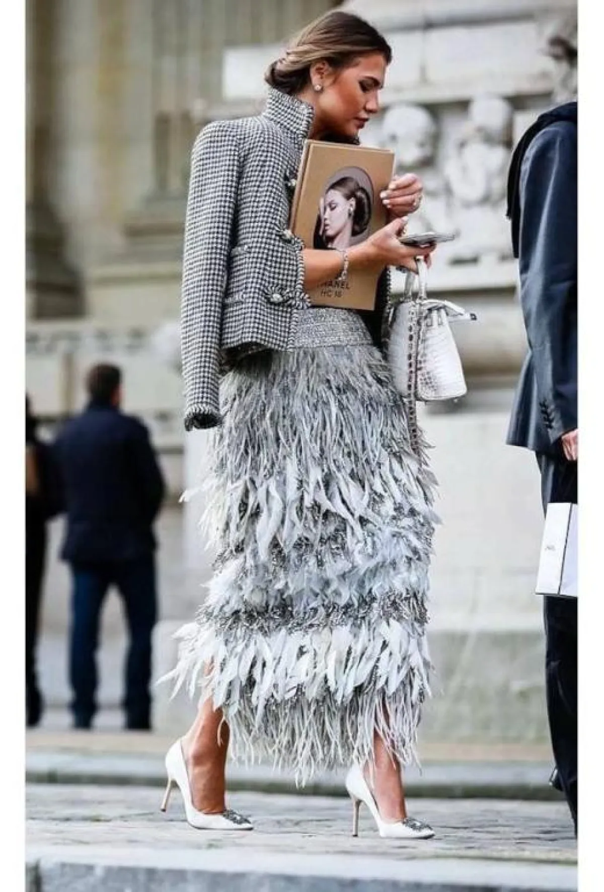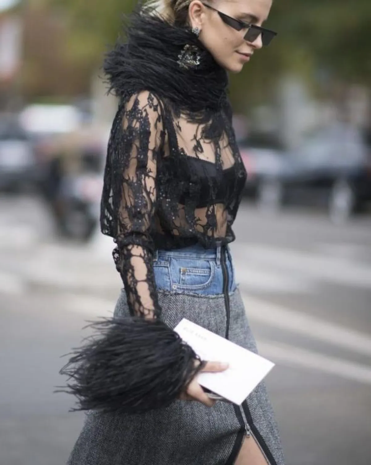 بعيدًا عن النجمات، شاهدنا الريش من خلال موضة الشارع تزين أكمام الكنزات الصوف، وأساور المعاطف، كذلك شاهدنا تنانير من الريش، أما الأغرب وربما الأجرأ، فكان الجينز المزين في نهاية الساق بطوق من الريش.