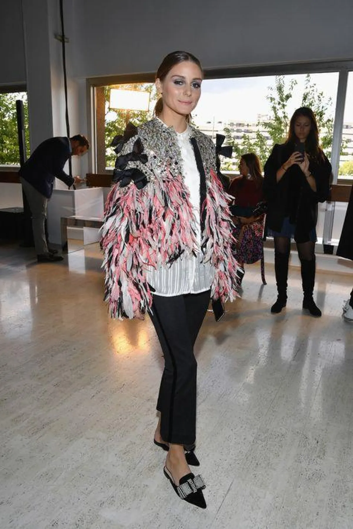 الفاشينيستا العالمية أوليفيا باليرمو، واحدة من المغرمات بموضة الريش. اعتمدت الريش من خلال جاكيت أسود مزين بريش ملون على الأكمام، كذلك، ارتدت جاكيت من الريش باللون اللافندر الفاتح، ونسقته مع بنطلون مطبع بنقشة الكاروهات وتي شيرت عصري.