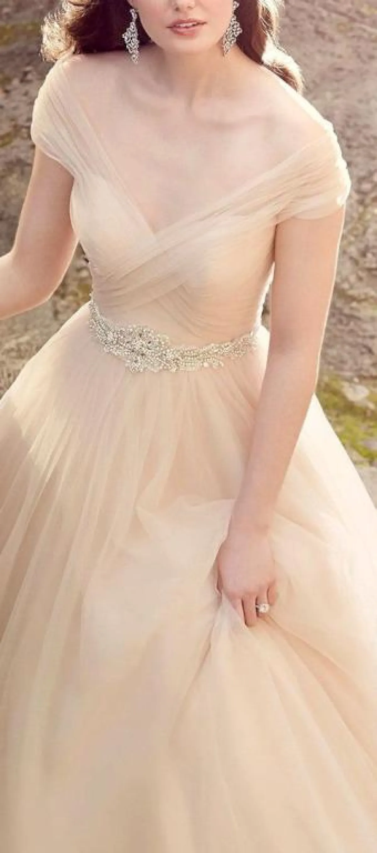 من الموديلات التي أعجبتنا لحزام الخصر، هو اختيار الموديل المرصع بأحجار اللؤلؤ. مناسب أكثر إن اعتمدته مع الفساتين التول أو الدانتيل الناعمة لإطلالة ملكية، مع اللون الكريمي للفستان، وكذلك للون الحجر.