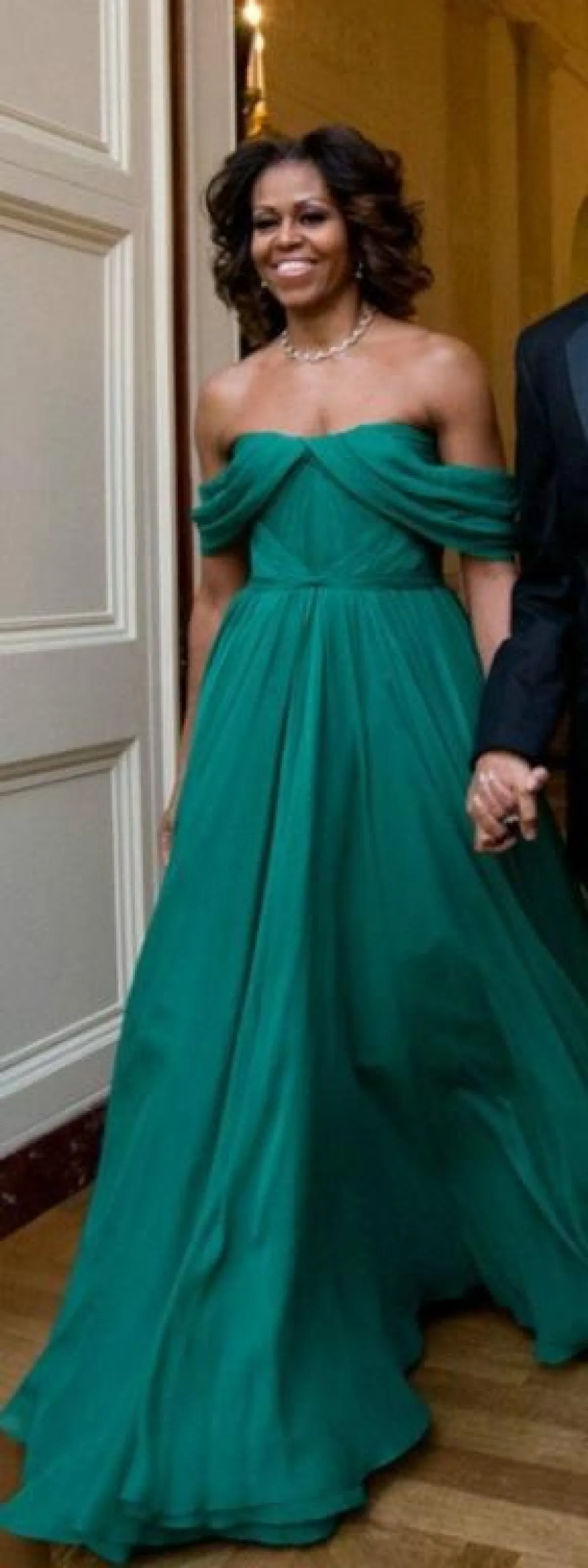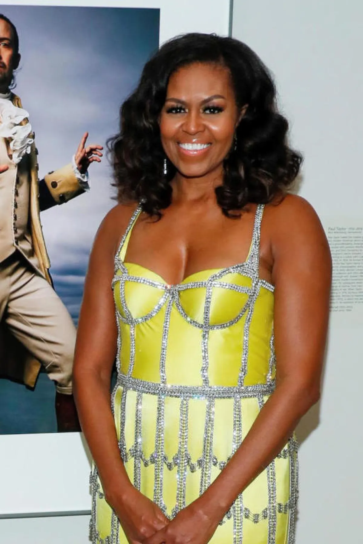 جلبت ميشيل أوباما زوجة الرئيس الأمريكي السابق باراك، الأنظار إليها، بإرتداءها فستان سهرة طويل، يتميز بلونه الأصفرالفاقع وهو فستان "هوت كوتير "من تصميم دار سياكابيلي Schiaparelli ، وقد وصف دانيال روزبيري Daniel Roseberry ،المدير الإبداعي لهذه الدار إختيارميشيل أوباما لهذه الإطلالة بقوله :" إن هذا الفستان يعكس بإمتياز قوة السيدة ميشيل أوباما ".