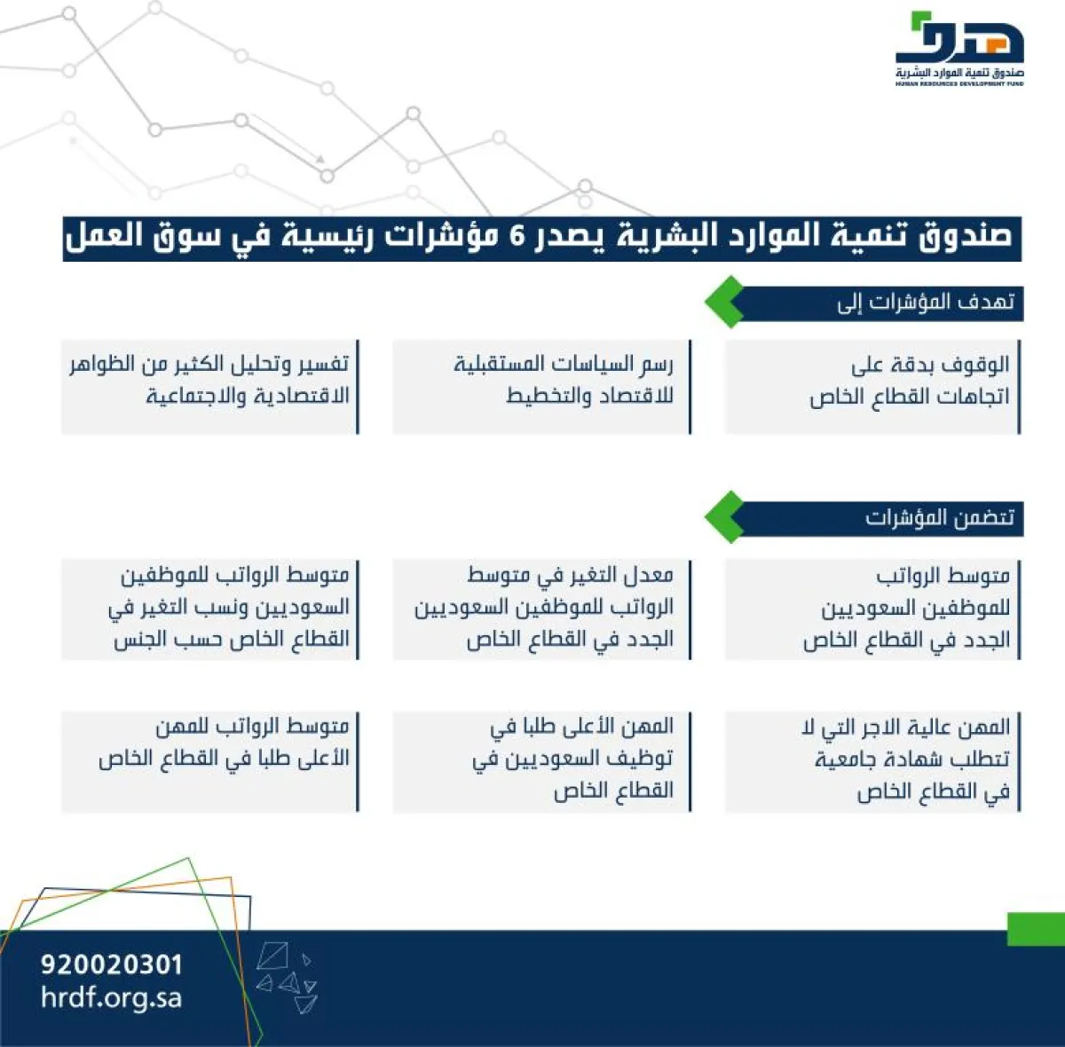 أصدر المرصد الوطني للعمل التابع لصندوق تنمية الموارد البشرية (هدف) ستة مؤشرات رئيسية في سوق العمل تهدف إلى الوقوف بدقة على اتجاهات القطاع الخاص ورسم السياسات المستقبلية للاقتصاد والتخطيط وتفسير وتحليل الكثير من الظواهر الاقتصادية والاجتماعية.