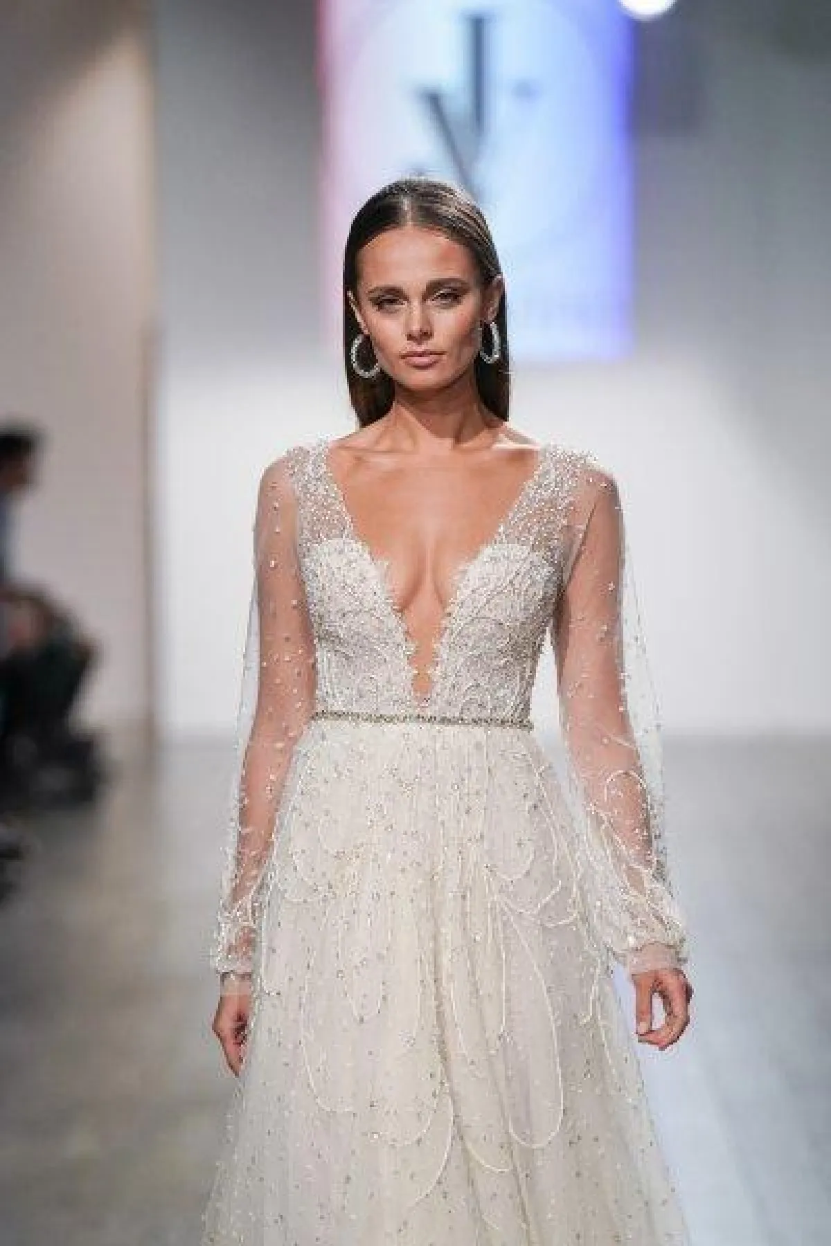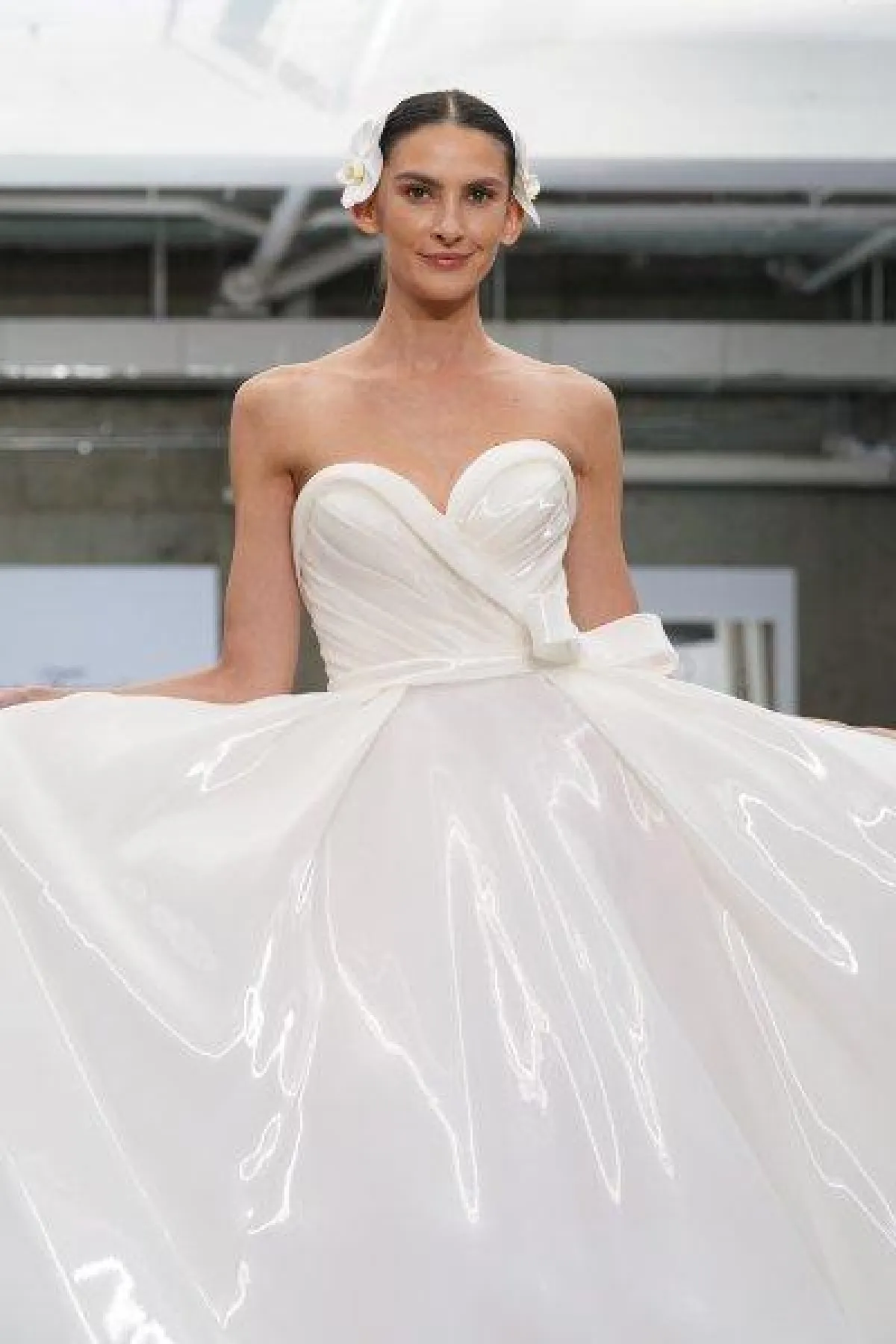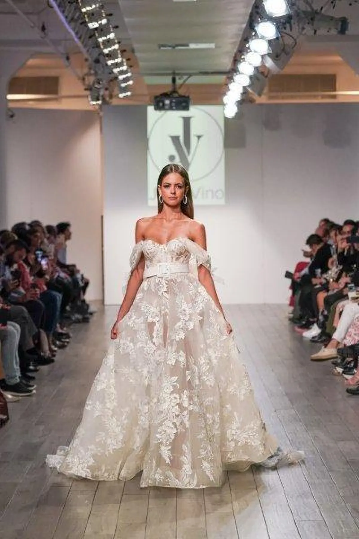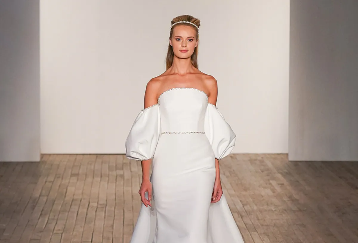 كما قدمت ماركة جولي فينو Julie Vino فساتين زفاف بتصاميم ناعمة مع أحزمة برّاقة لتضيف لها لمسة فاخرة.