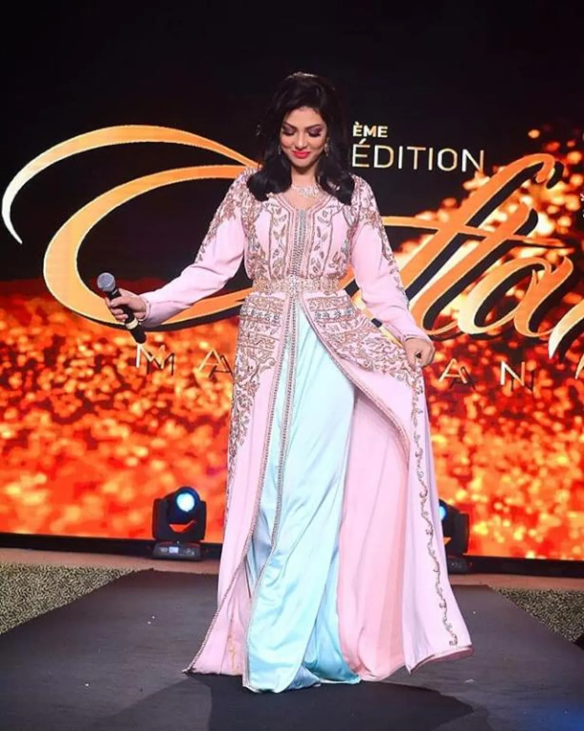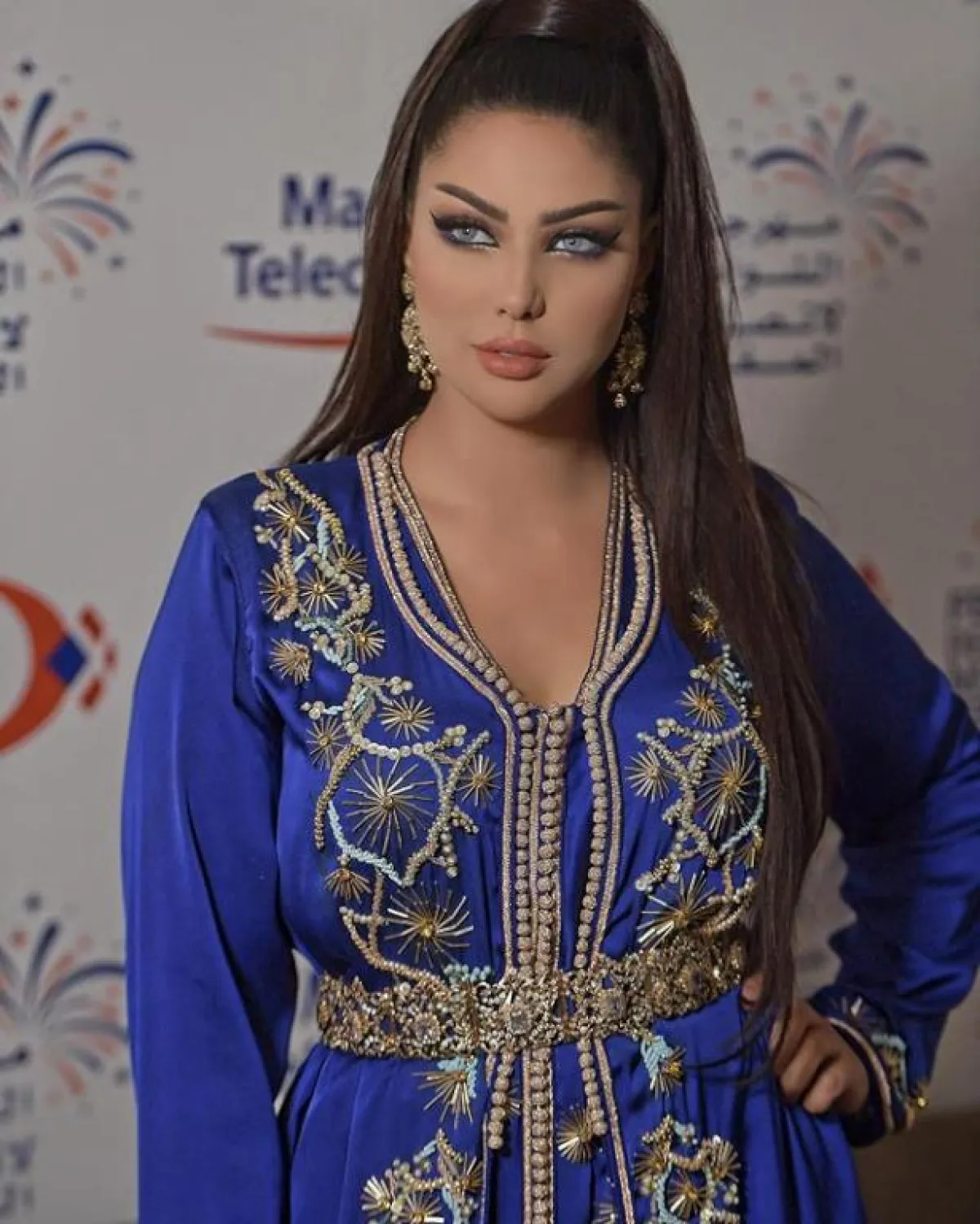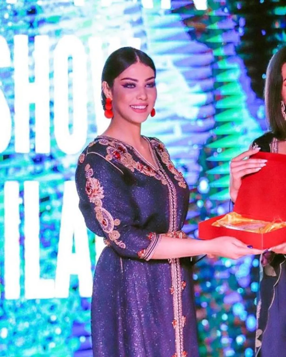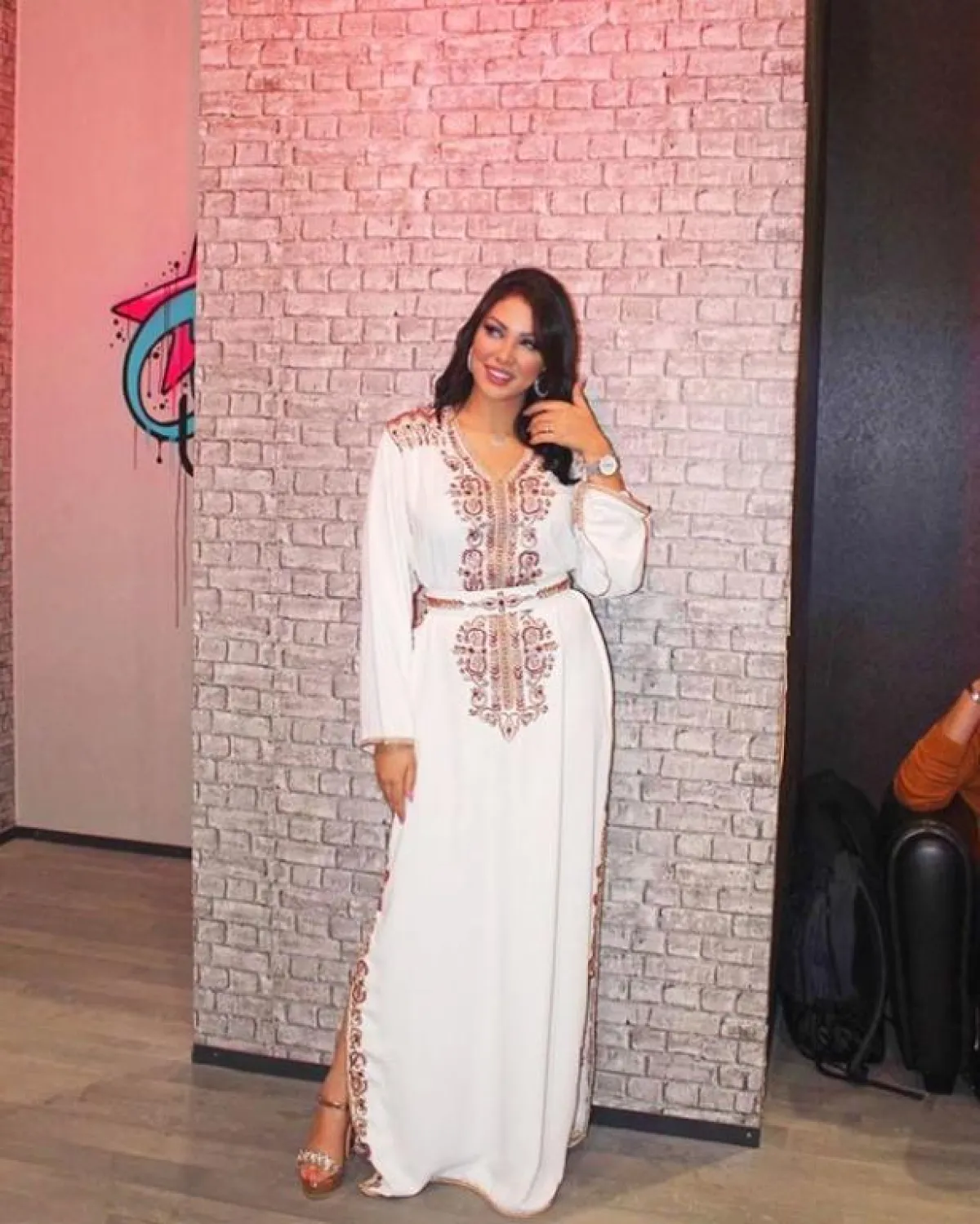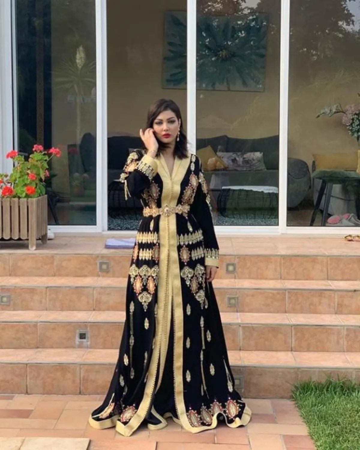ذوق المغنية ابتسام تسكت ينعكس بشكل واضح على خياراتها الأنثوية المختلفة، كهذا القفطان المخملي المزين بالورود الملونة المختلفة، مع حزام الخصر الذهبي المطرز مع الفستان.