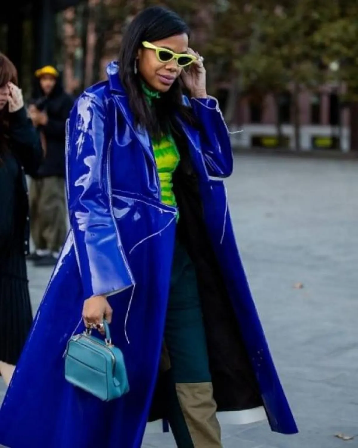 معطف طويل باللون الأزرق من خامة مضادة للماء، هذا سيكون مميز وخاصة في الأيام الممطرة.