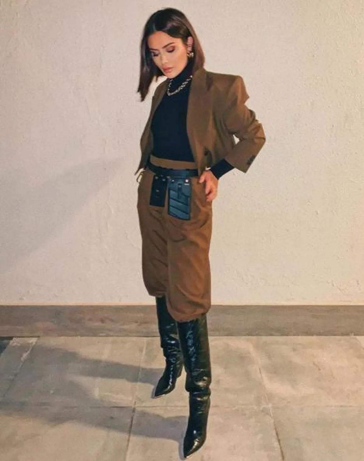 شاهدنا ديما الأسدي في لوك عصري نسقت فيه بدلة رسمية بتصميم شبابي باللون البني، مؤلفة من جاكيت بليزر قصير وبنطلون بقصة أرجل واسعة، ومن تحتها اختارت توب بياقة عالية باللون الأسود، وقد زينت خصرها بحقيبة مبتكرة، وأكملت الاطلالة بجزمة عالية باللون الأسود وبعض الاكسسوارات الذهبية.