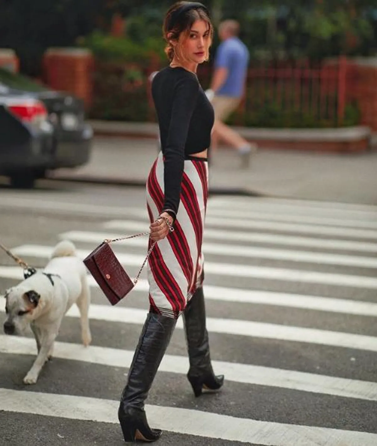 نور عريضة تألقت في لوك شتوي مميز مؤخرًا، وقد نسقت فيه تنورة ميدي باللونين الأحمر والأبيض مع توب قطنية بأكمام طويلة، واختارت مع الاطلالة جزمة عالية من الجلد باللون الأسود، وحقيبة كتف باللون العنابي، وزينت شعرها باكسسوار ناعم.
