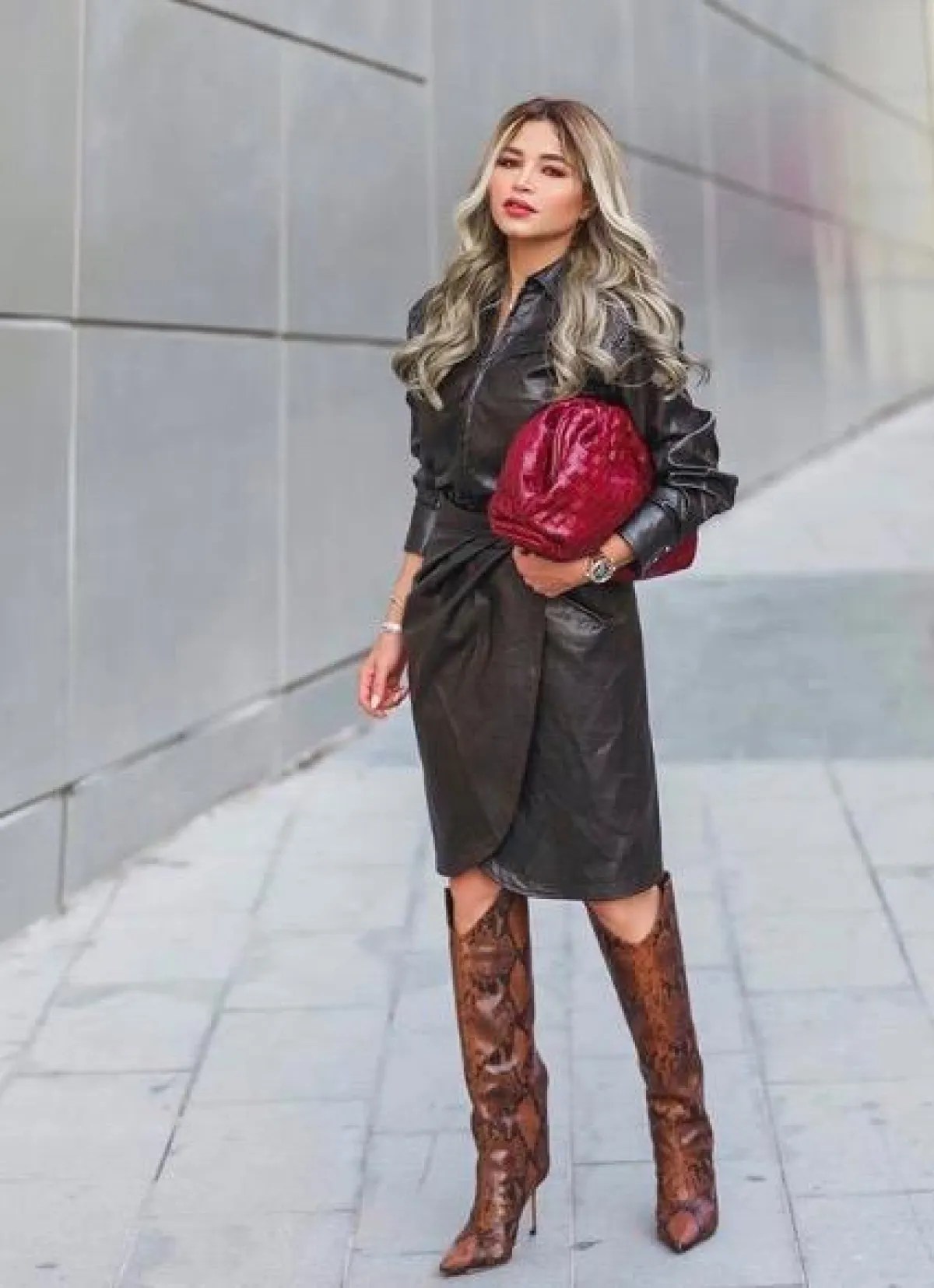 اختارت نهى نبيل تنسيقًا أنيقًا من الجلد، وقد اختارت فيه فستان ميدي من الجلد باللون البني، تصميمه أنيق بقصة القميص من الأعلى، وأكمامه طويلة، وقد نسقت معه جزمة عالية باللون العسلي بنقشة جلد الأفعى، وحقيبة كلاتش كبيرة باللون الأحمر من بوتيغا فينيتا Bottega Veneta.