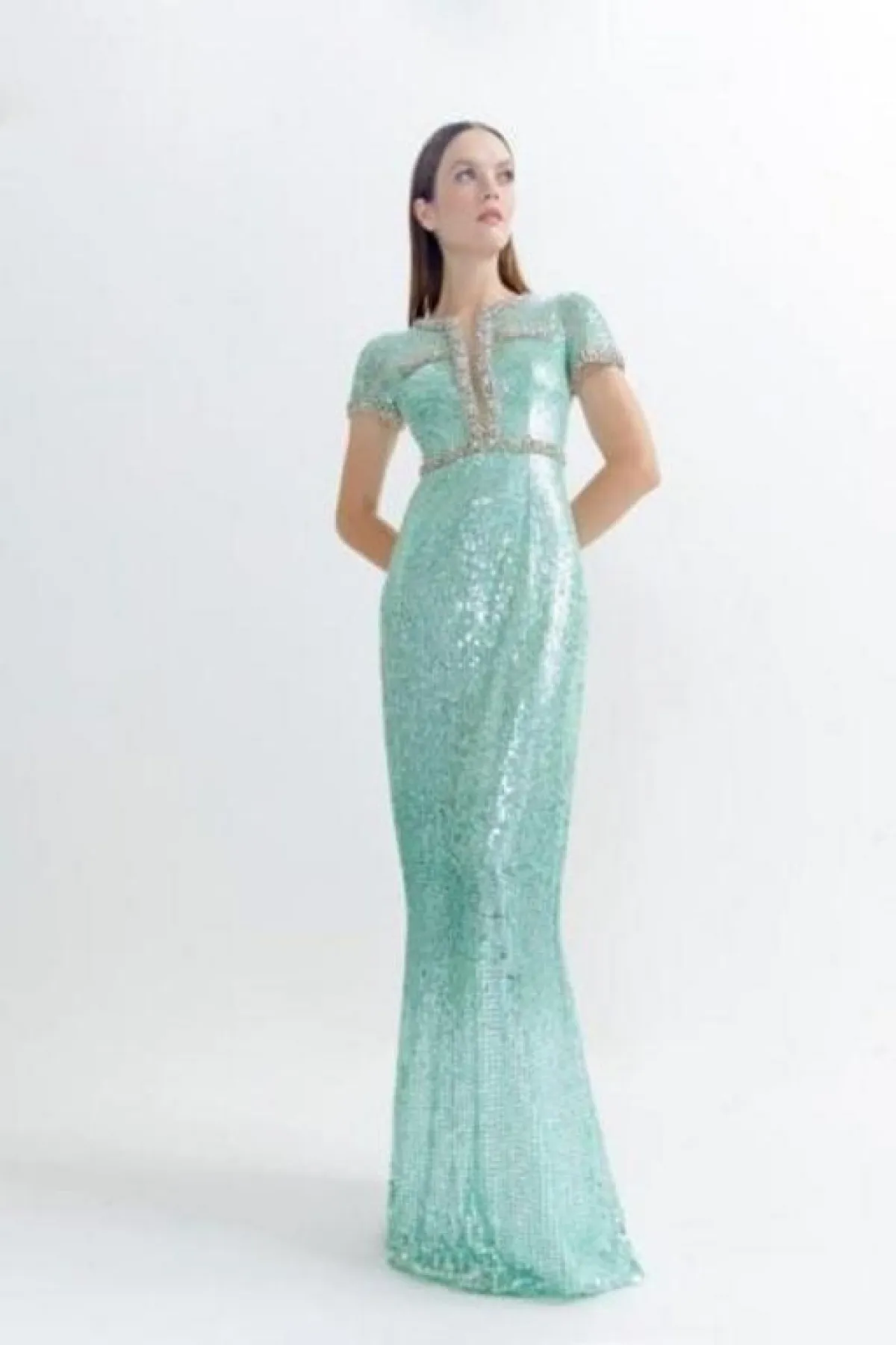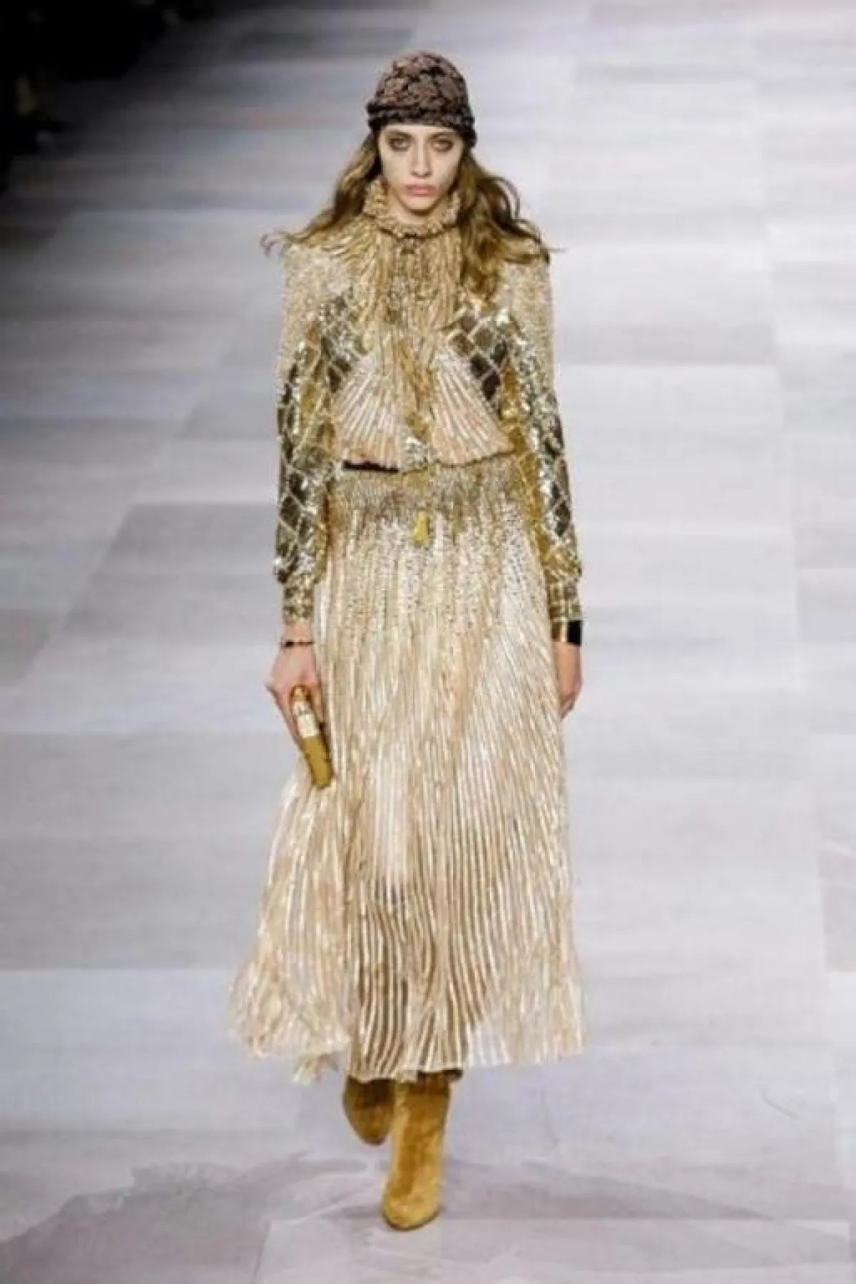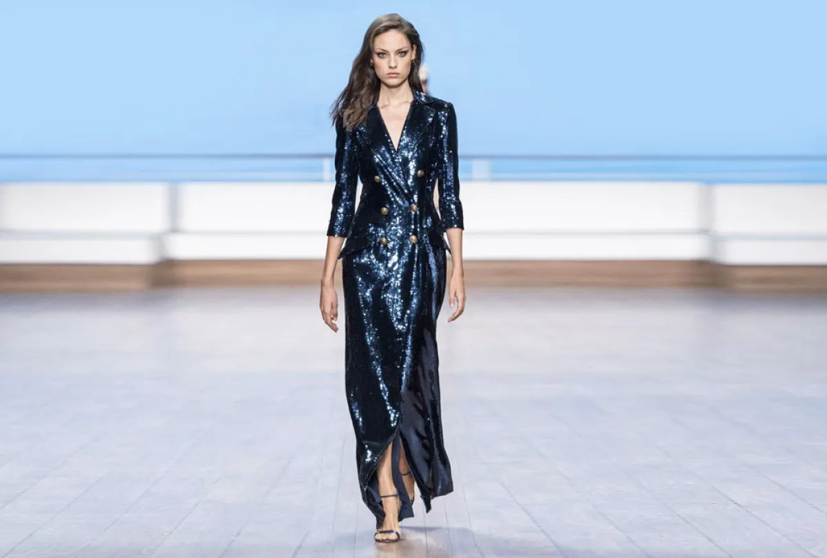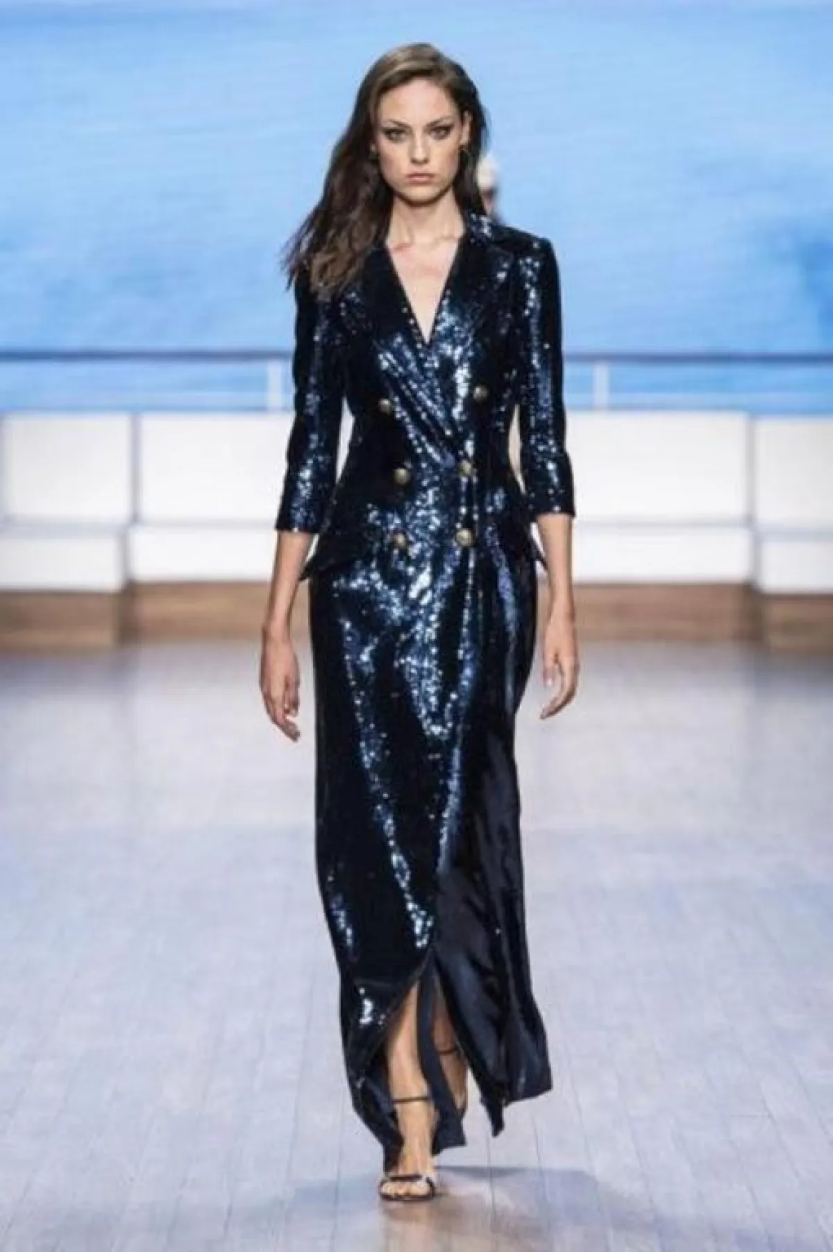 برزت هذا العام صيحة فساتين السهرة المصممة بطراز المعطف الطويل، قدمت ماركة إليزابيتا فرانشي Elisabetta Franchi تصميم Double breasted مزدان بالترتر اللامع سيعزز أناقتك ويمنحها طابع شتوي في سهرات رأس السنة كما سيوحي بأنك أكثر طولًا.