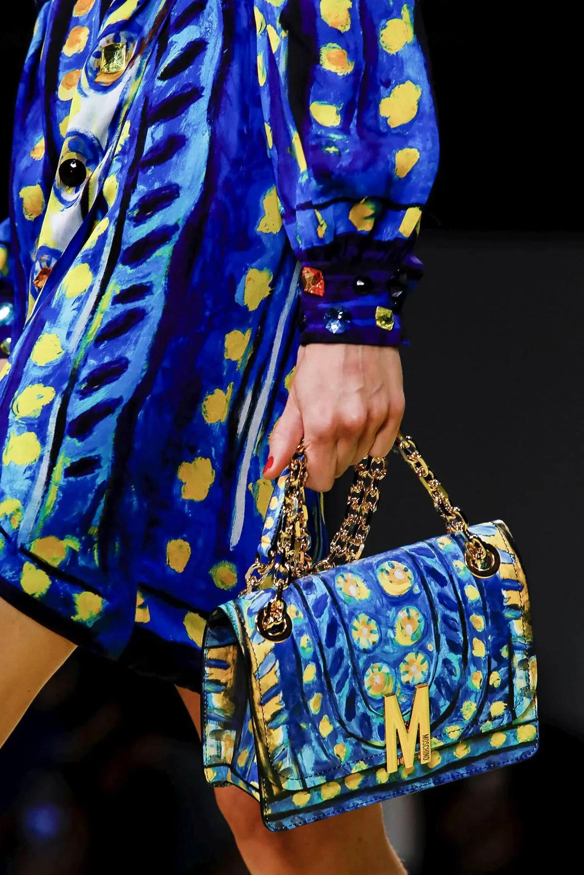 استحوذت حقائب اليد المزينة بالطبعات على إهتمام أشهر المصممين، قدم بعضهم تصميمات مزينة بالرسومات والورود مثل ماركة Zimmermann، موسكينو Moschino وميوميو Miu Miu، كما لفتنا الحضور الطاغي للحقائب المصممة بجلود الحيوانات والتي زينت إطلالات عارضات بوتيغا فينيتا Bottega Veneta ودولتشي آند غابانا Dolce & Gabbana، أيضًا حقائب الكتف المطبعة بنقاط البولكا البيضاء من مجموعة مايكل كورس Michael Kors.