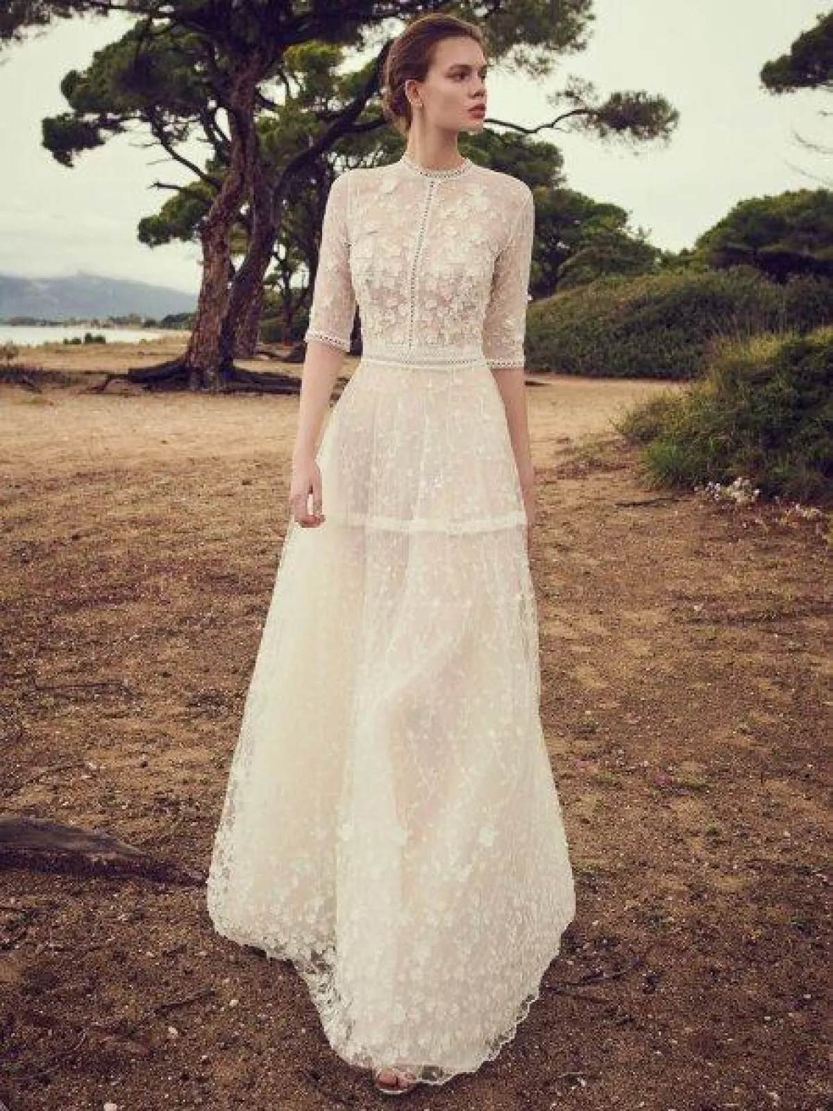 تجمع فساتين الزفاف بالأكمام متوسطة الطول بين الرقي والإحتشام، وقدمت بعض الماركات موديلات فساتين زفاف بهذه الصيحة، مثل فساتين زفاف Costarellos، وواترز Watters.