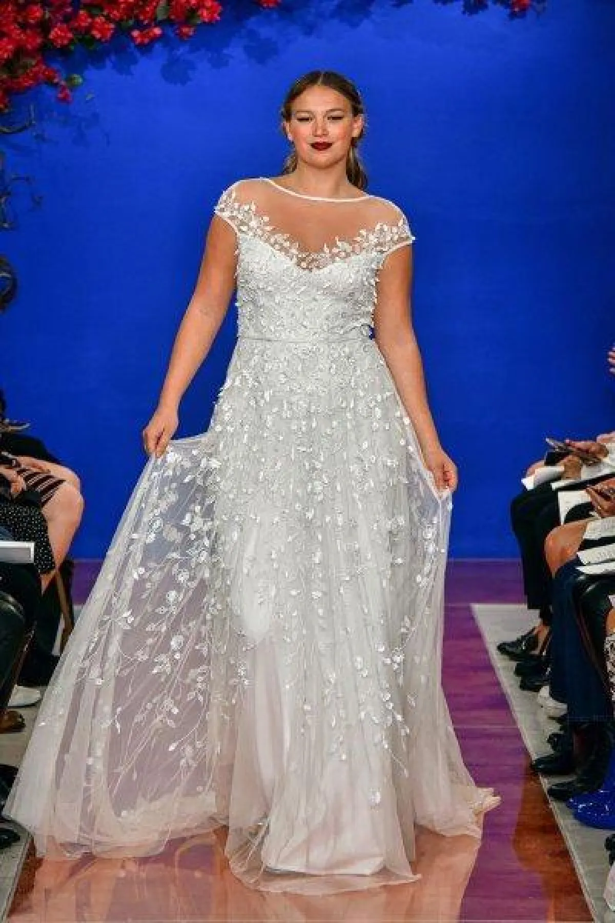 وللعروس الممتلئة، قدمت ماركة ثيا Theia فستان زفاف بأكمام قصيرة جداً ومزين بالورود البيضاء البارزة.