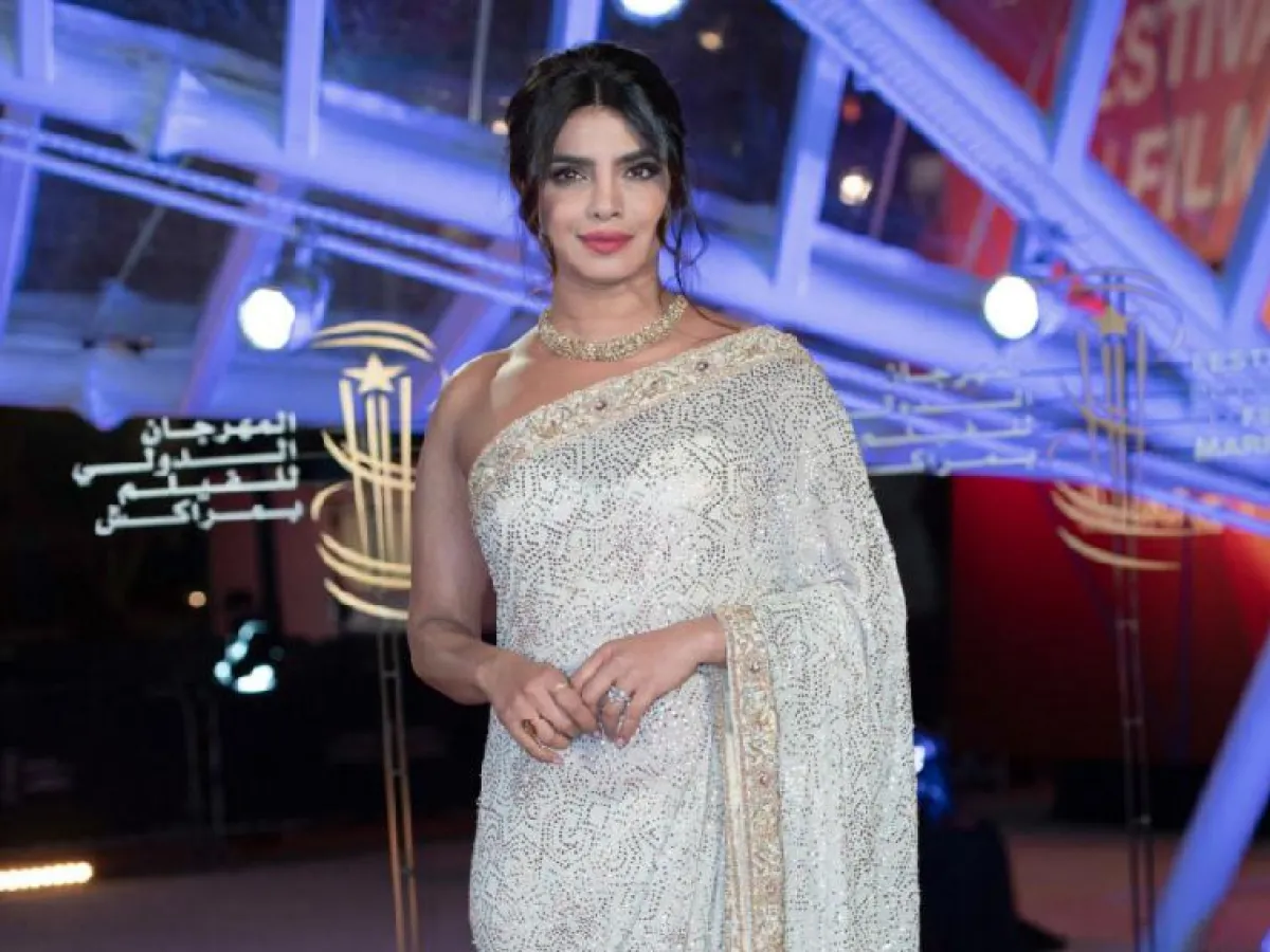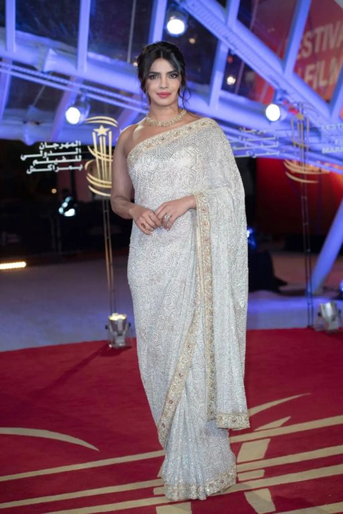 اطلالة مميزة في حفل افتتاح مهرجان مراكش السينمائي، اختارت فيها بريانكا شوبرا Priyanka Chopra الساري الهندي التقليدي باللونين الفضي الذهبي، بقصة الكتف الواحدة الذي التفت حول الجسم وقد نسقت معه عقدًا ماسيًّا فاخرًا.
