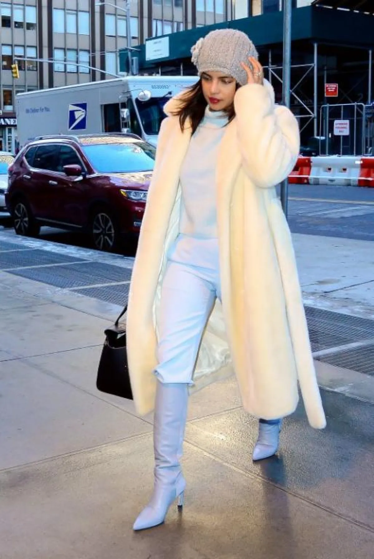في الاطلالة الأولى اختارت بريانكا تنسيقًا شتويًّا كاجوال باللون الأبيض، كان عبارة عن توب بياقة عالية نسقت معها بنطلونًا قطنيًّا، ومن فوقه اعتمدت جزمة عالية من الجلد، وأكلمت اللوك بمعطف طويل من الفرو، وشنطة يد من الجلد الأسود، وقبعة من الصوف باللون الرمادي.