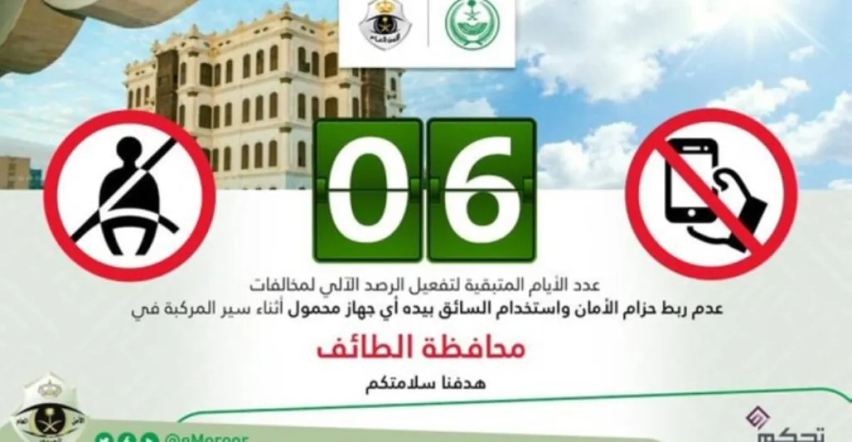 وقالت إدارة المرور، في تغريدة على موقع "تويتر"، 6 أيام.. عدد الأيام المتبقية لتفعيل الرصد الآلي لمخالفتي عدم ربط حزام الأمان، واستخدام السائق بيده أي جهاز محمول أثناء سير المركبة في محافظة الطائف.