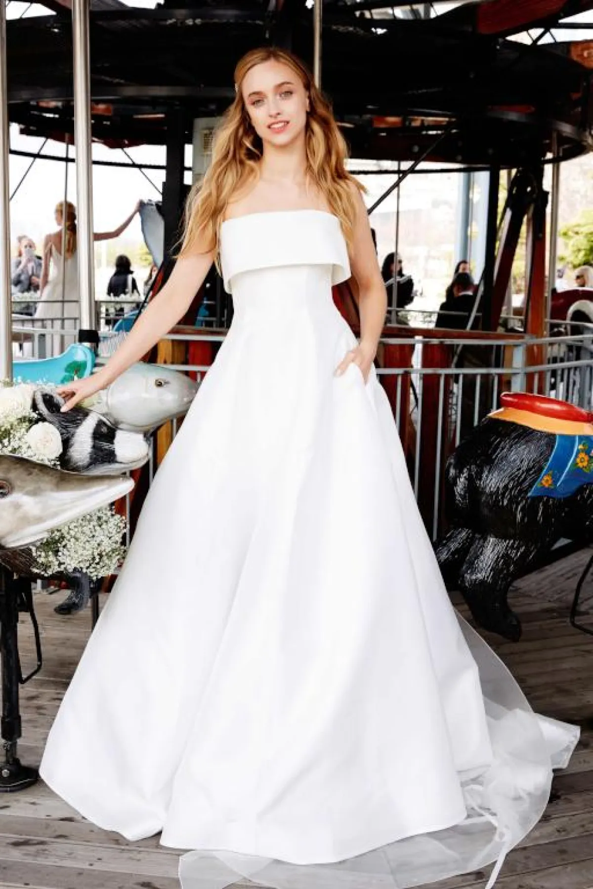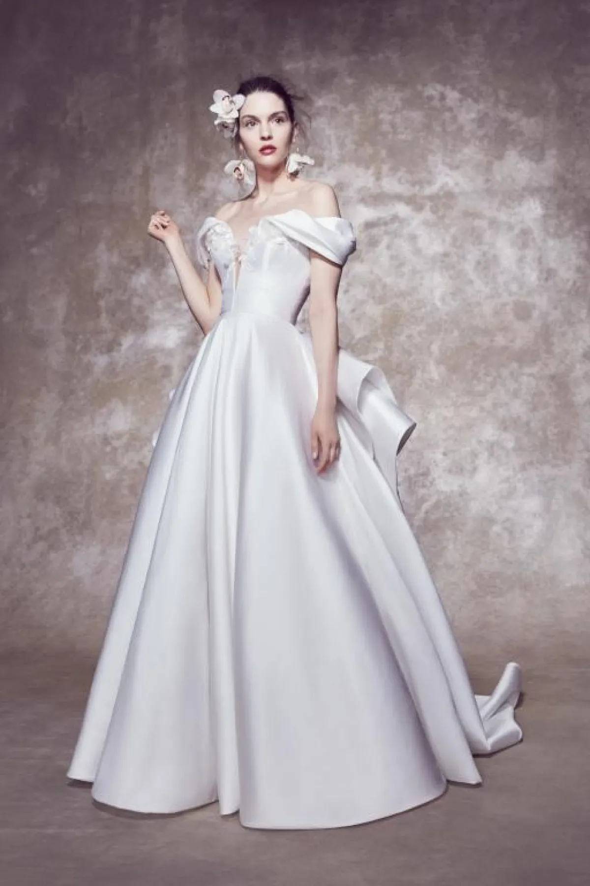 موضة الأكتاف المنسدلة مازالت مسيطرة على عالم الموضة بشكل لم نكن نتوقعه ، حتى بفساتين الزفاف المختلفة، يمكنك اعتماد هذا الفستان الأنيق من مونيك لوليير، مزركش بسيط بنفس الألوان، ليمنح الصبية إطلالة ناعمة وفخمة بالوقت نفسه.