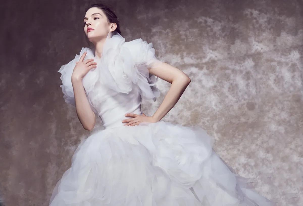 التول والدانتيل بفستان الزفاف هما عنوان الأناقة والأنوثة، كهذا التصميم من Marchesa، مع الأكتاف المنفوشة على شكل ورود من التول، والتول المكشكش بطريقة طبقية على الجزء المنفوش من الفستان، لإطلالة مستوحاة أيضًا من أجواء التسعينات.