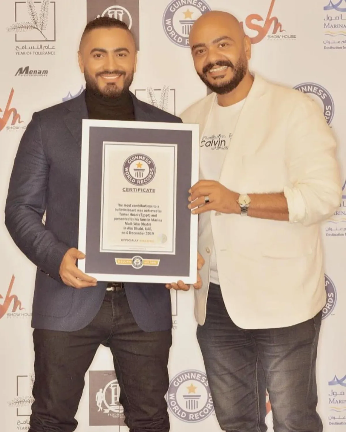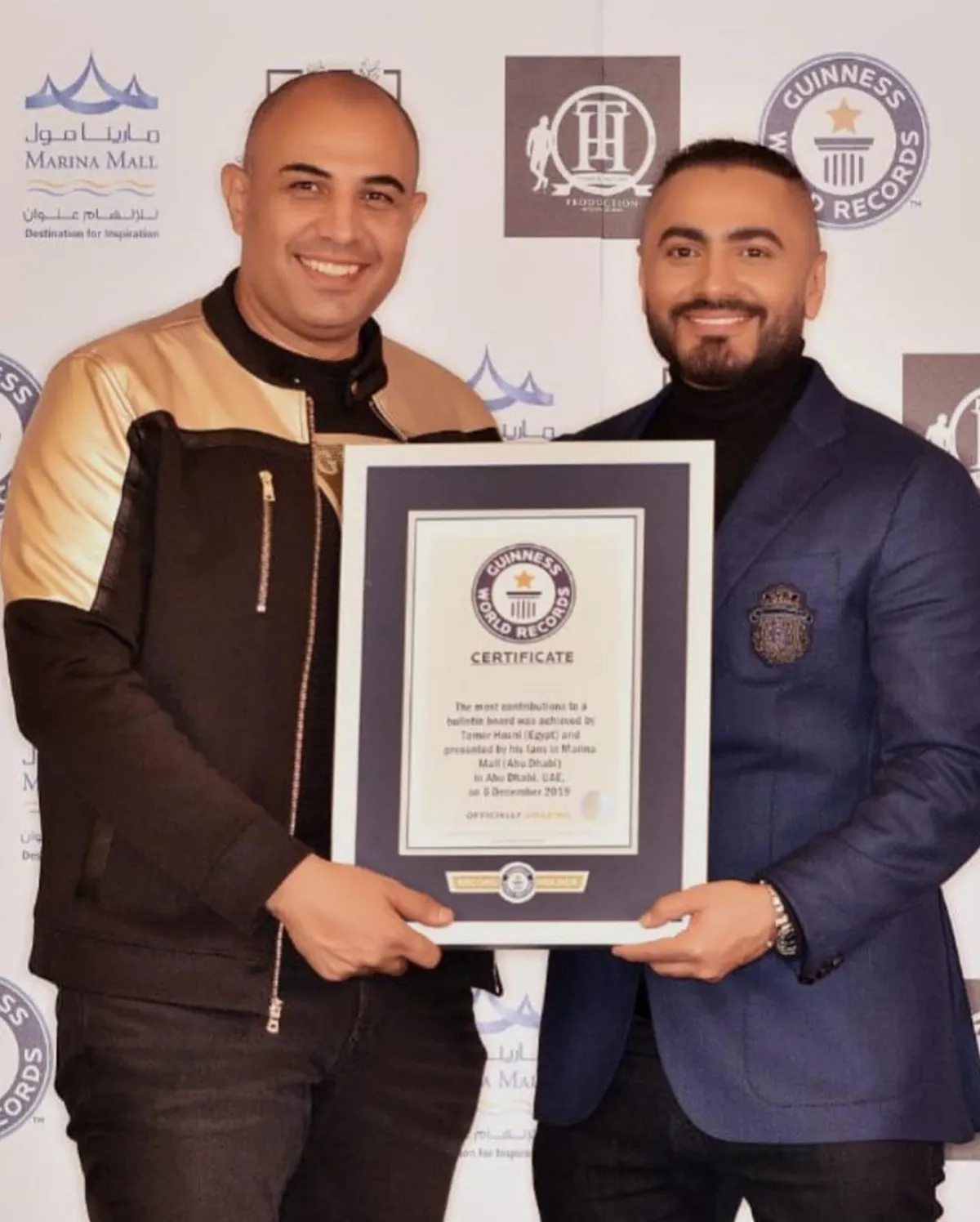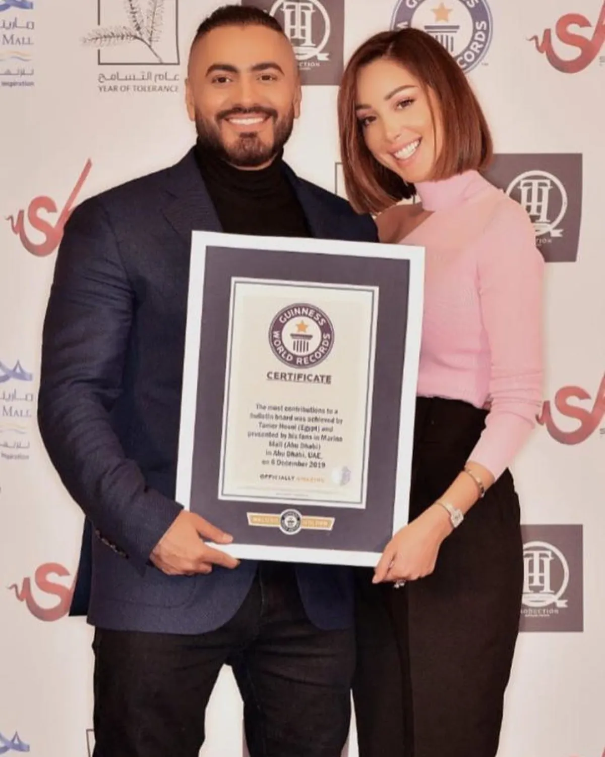 وقدّمت الموسوعة التهنئة لمارينا مول أبو ظبي والفنان المصري تامر حسني بعد نجاحهما في تحقيق أكثر عدد مشاركات على لوحة إعلانات بـ12086 مشاركة، متخطين الرقم القياسي السابق الذي وقف عند 4900 مشاركة جرى تسجيلها في الخامس من شهر ديسمبر 2017.