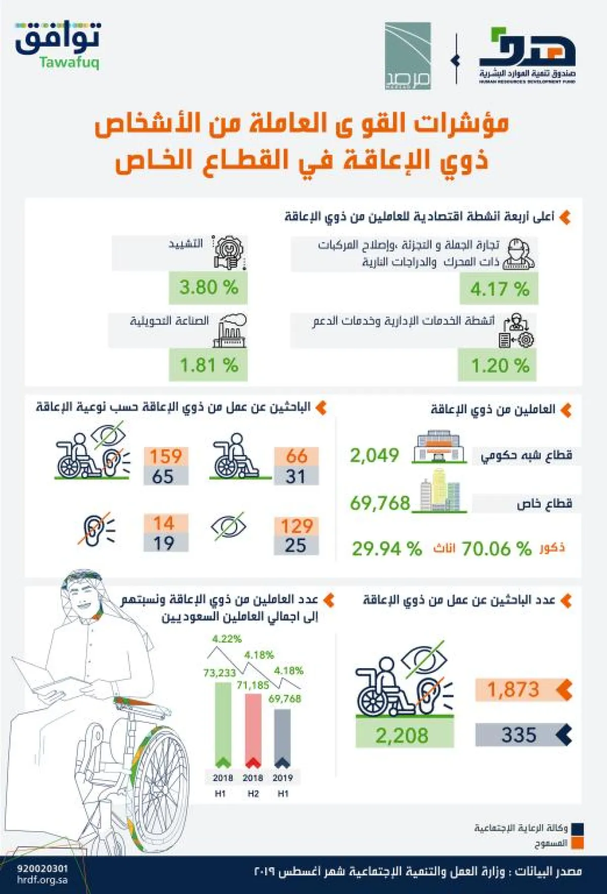 بلغ عدد العاملين السعوديين من الأشخاص ذوي الإعاقة المسجلة بياناتهم في المؤسسة العامة للتأمينات الاجتماعية في النصف الأول من العام الميلادي الجاري يبلغ 48,877 مواطناً و20,891 مواطنة، بإجمالي 69,768 مواطناً ومواطنة)؛ يشكّلون 4.22 % من إجمالي العاملين السعوديين في سوق العمل.
