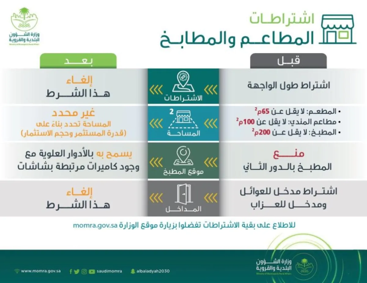 كما شملت الاشتراطات الفنية لأنشطة المطاعم والمطابخ إلغاء اشتراط مدخل للعزاب ومدخل للعوائل، وإلغاء شرط طول الواجهة، وعدم تحديد مساحات خاصة، إضافةً إلى السماح بعمل المطابخ في الأدوار العلوية بشرط وضع كاميرات مراقبة مرتبطة بشاشات.