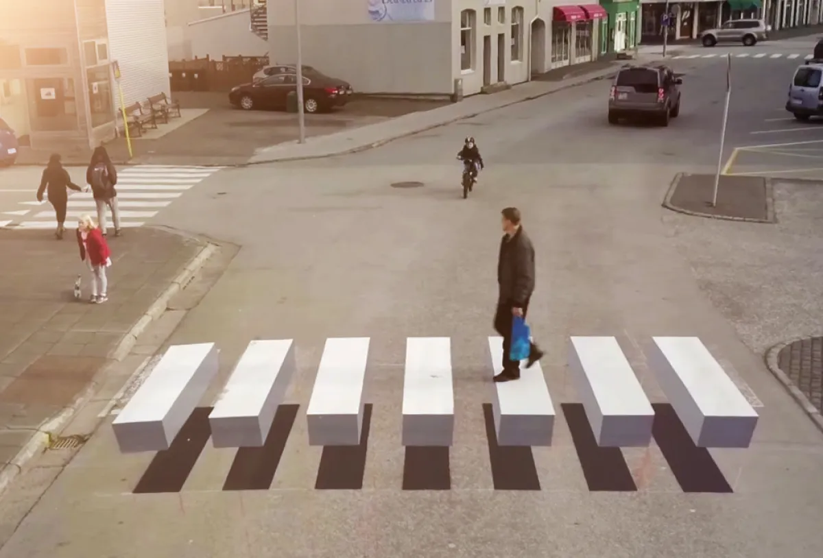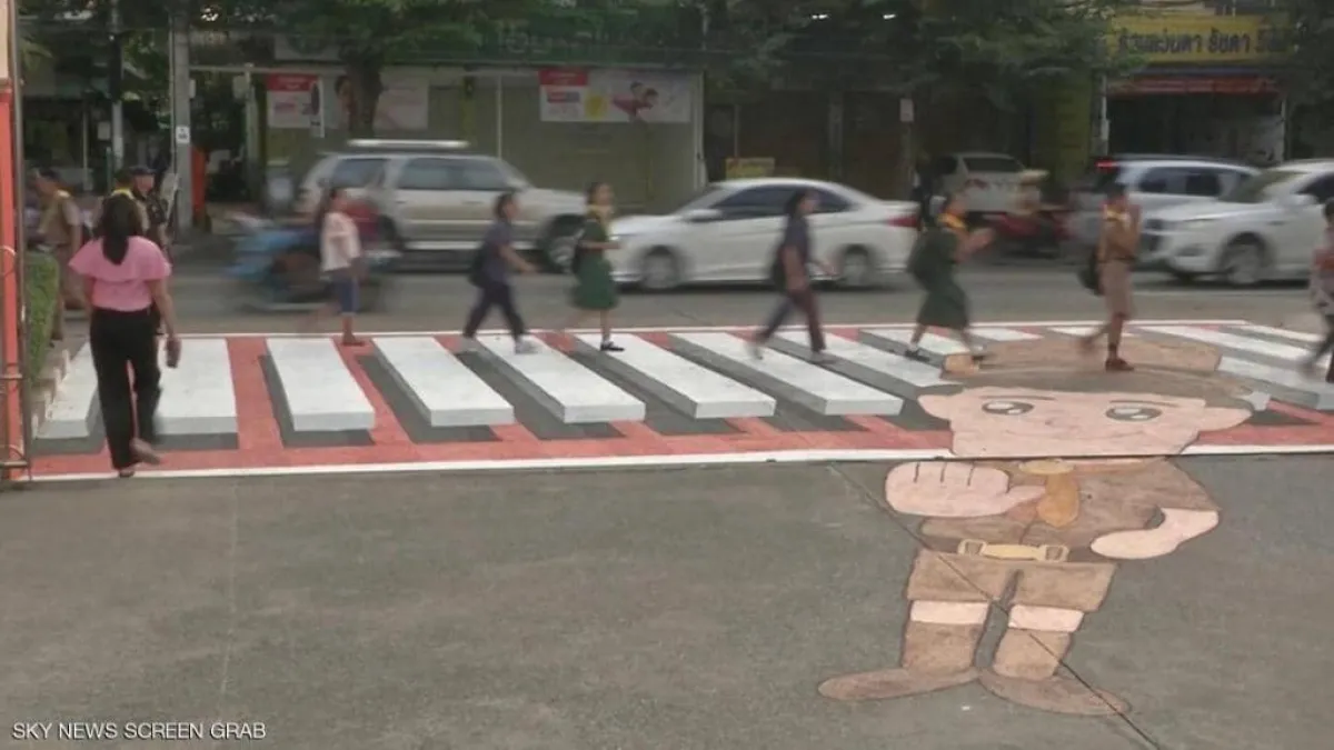 ابتكرت مجموعة من المتطوعين في تايلاند ممراً للمشاة، بتقنية البعد الثالث، بحيث يبدو من يعبر الممر بلونيه الأبيض والأسود كما لو كان يحلق فوق الطريق وذلك بهدف جذب اهتمام سائقي السيارات وتعزيز سلامة المشاة.