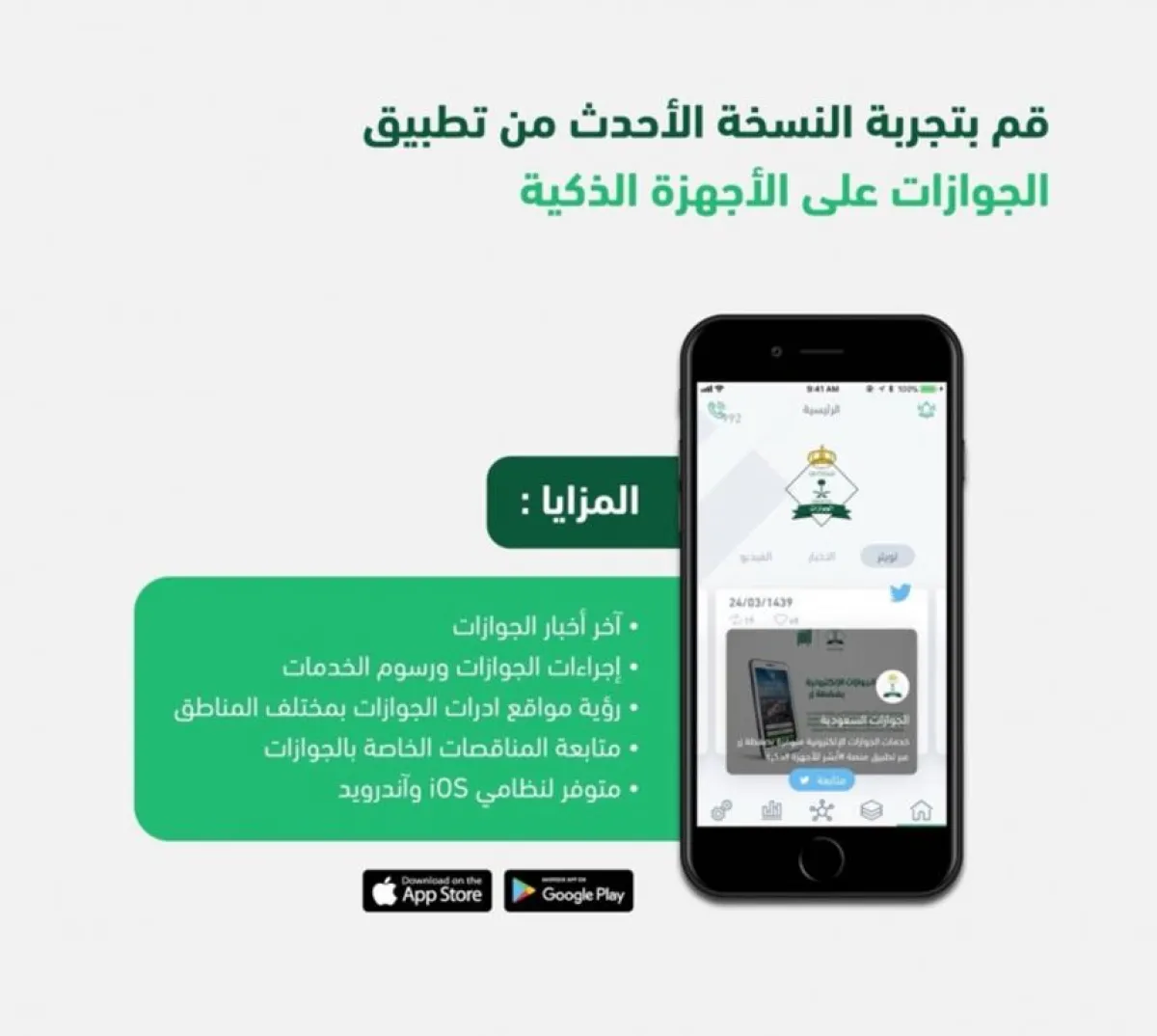 يدعم الإصدار الحديث لتطبيق "الجوازات" على الأجهزة الذكية اللغتين العربية والإنجليزية، ويتيح للمستخدمين الاستفادة من الخدمات الإلكترونية المتعددة، وذلك وفقاً لما كشفت عنه المديرية العامة للجوازات.