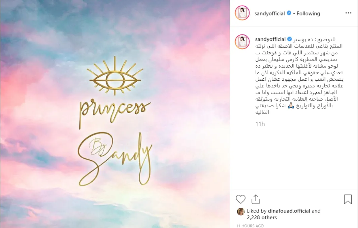 ساندي نشرت صورة لعلامة تجارية تملكها خاصة بخط إنتاج عدسات لاصقة يحمل اسمها، وعلقت عليها عبر حسابها بموقع إنستقرام قائلة: للتوضيح ده بوستر المنتج بتاعي للعدسات الاصقه اللي نزلته من شهر سبتمبر اللي فات وفوجئت ب صديقتي المطربة كارمن سليمان بعمل لوجو مشابه لأغنيتها الجديدة وبعتبر ده تعدي على حقوقي الملكية الفكرية.