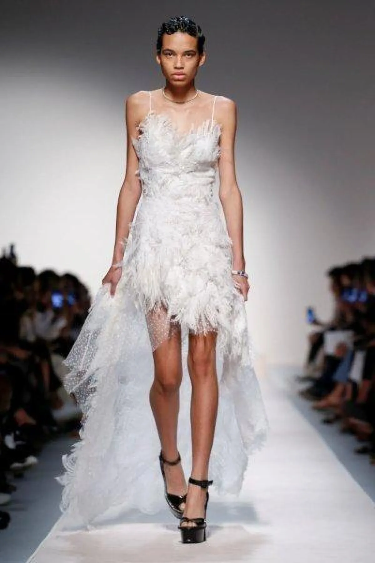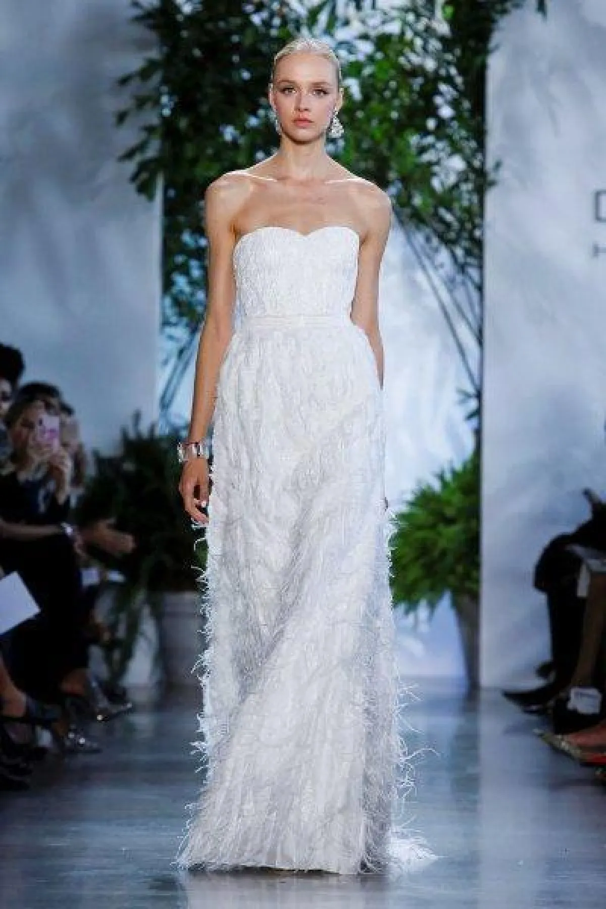 وقدمت ماركة دينيس باسو Dennis Basso فستان زفاف عمودي بتنورة مغطاة بالريش.